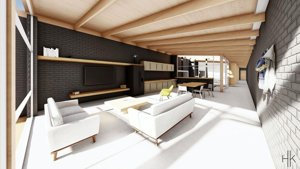 Open-plan living area with kitchen, dining, lounge