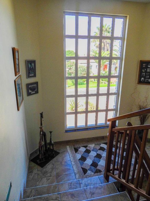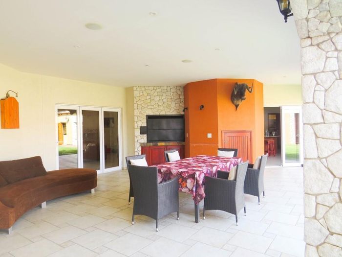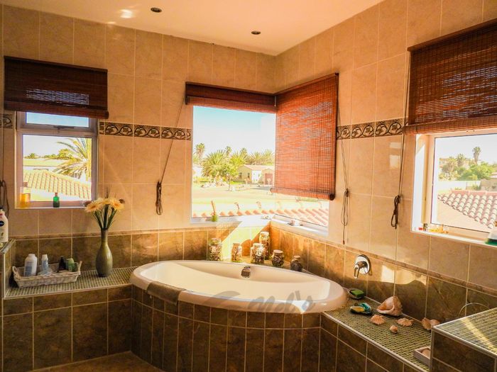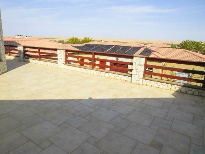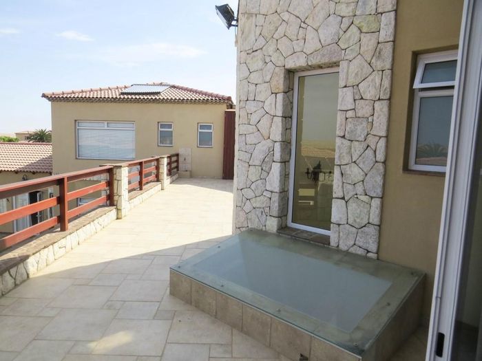 Rooftop terrace with built-in BBQ and seamless indoor–outdoor living in Rossmund Golf Estate, Swakopmund — corner erf on a greenbelt with partial golf-course views; three en-suite bedrooms.