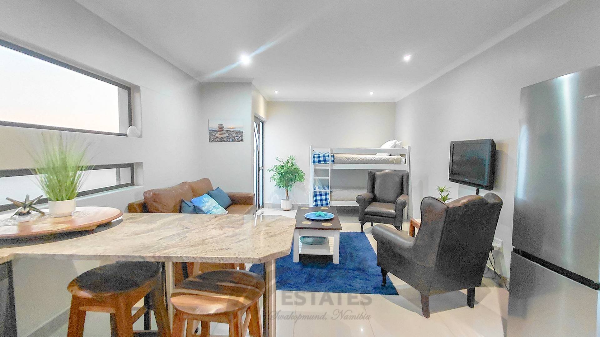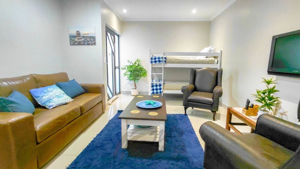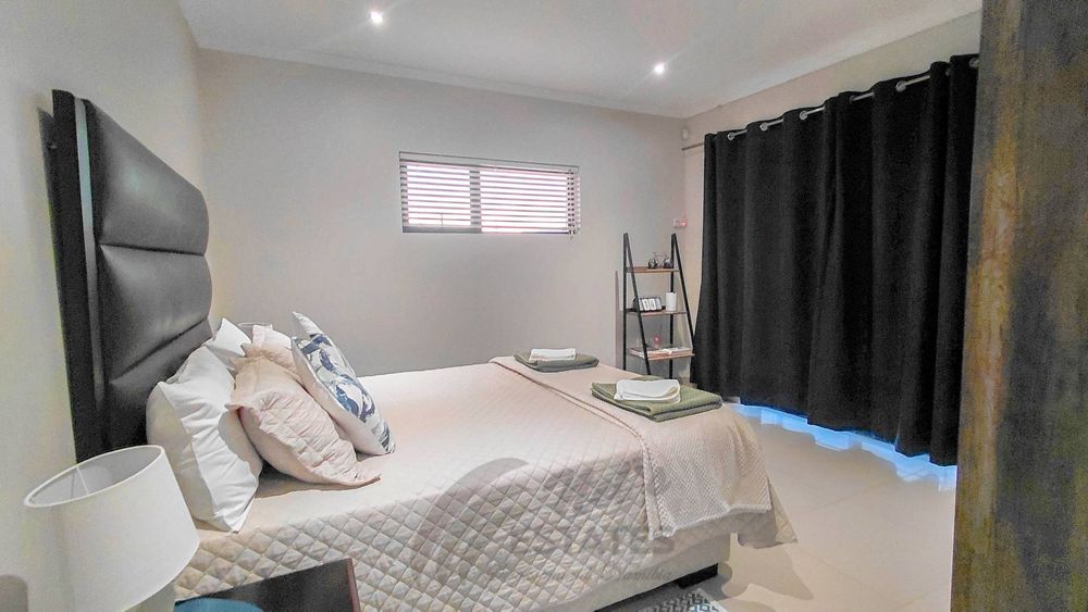 On the opposite side of the upper level, a fully self-contained flat offers its own gated entrance, ensuring privacy and independence. Currently used as an Airbnb, this unit presents an excellent income opportunity. It includes a fully fitted kitchen with breakfast counter, a comfortable TV/lounge area, a private balcony for sundowners or morning relaxation, and a generous bedroom with an ensuite bathroom.