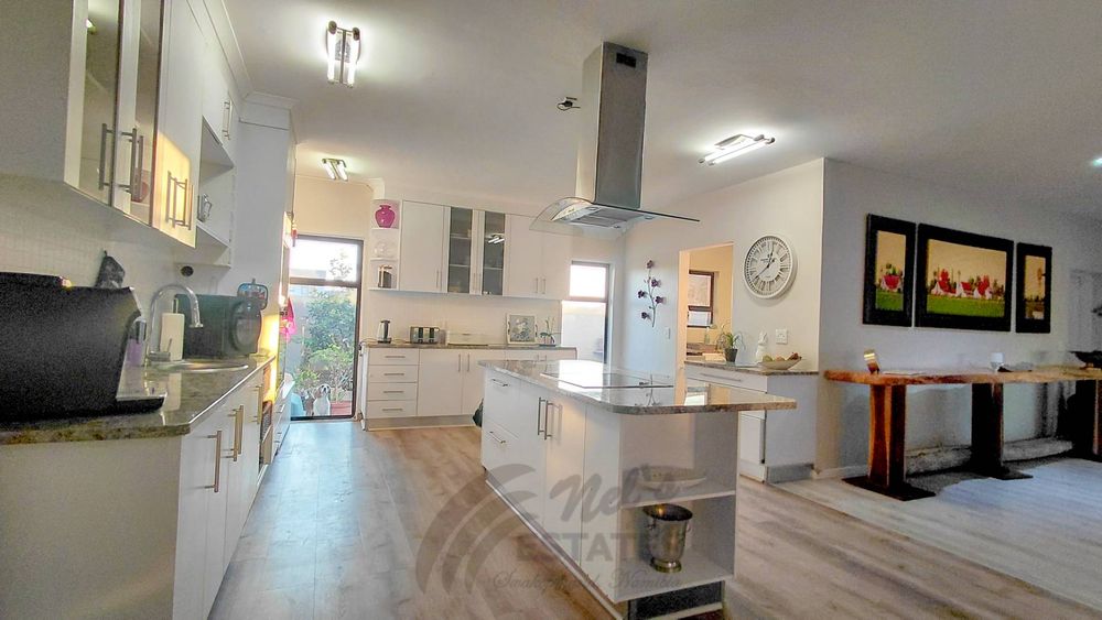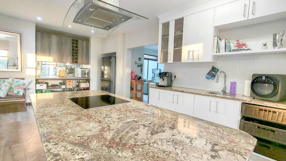 At the heart of the home lies a spacious, fully fitted kitchen designed for both functionality and style. It features a central island, breakfast counter, and a convenient bar or coffee station. A separate scullery and laundry area ensure practicality and organization.