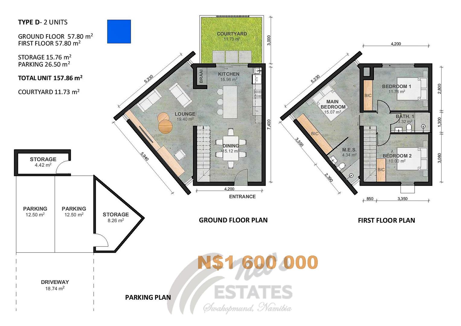 Type D – 3 Bedroom, 2 Bathroom, 1 Parking & Storage, Private Courtyard 12.00m2 – N$ 1 640 000.00 TOTAL 158 m2