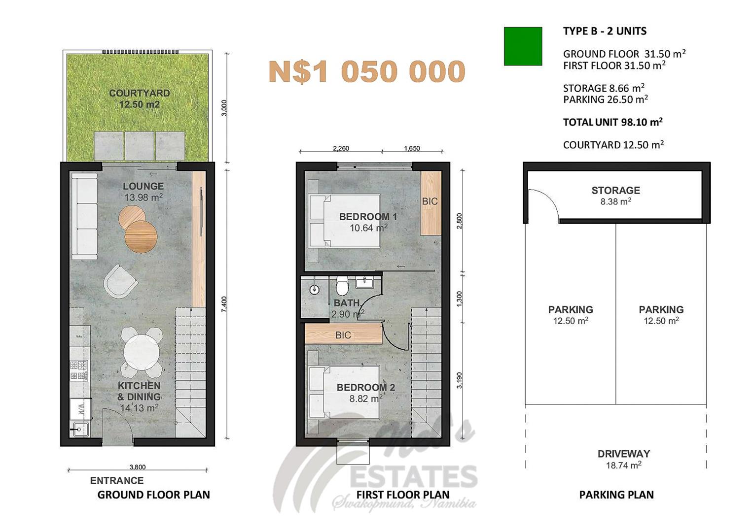 Type C – 2 Bedroom, 2 Bathroom, 2 Parking & Storage, Private Courtyard 12.00m2 – N$ 1 200 000.00 TOTAL 105 m2