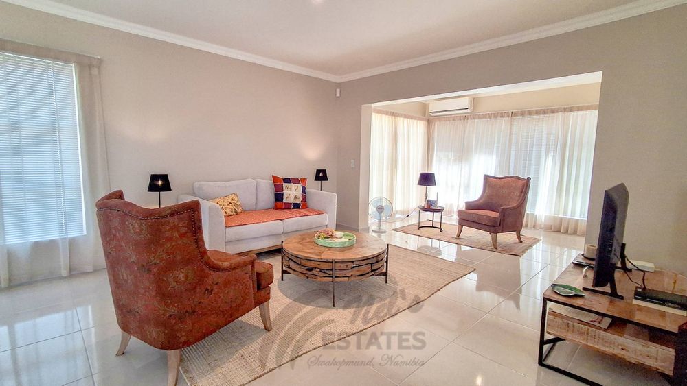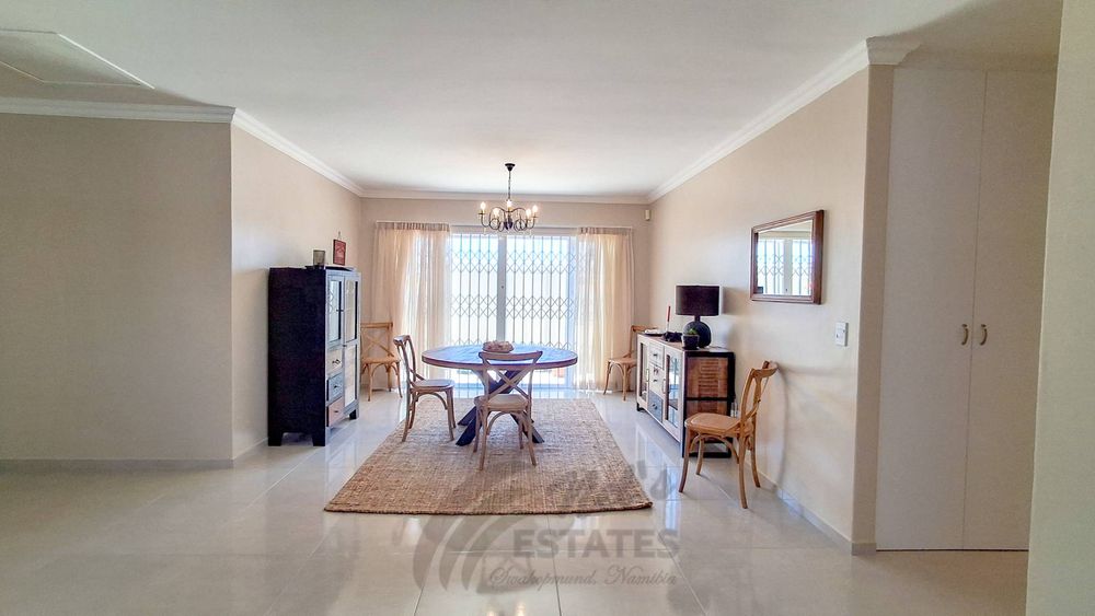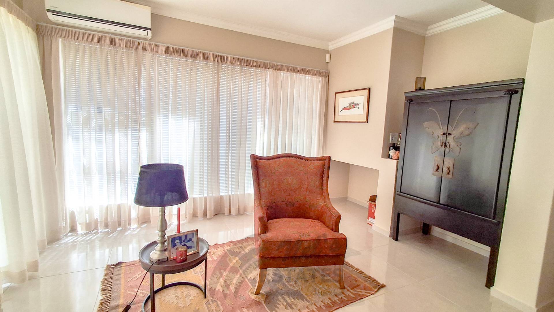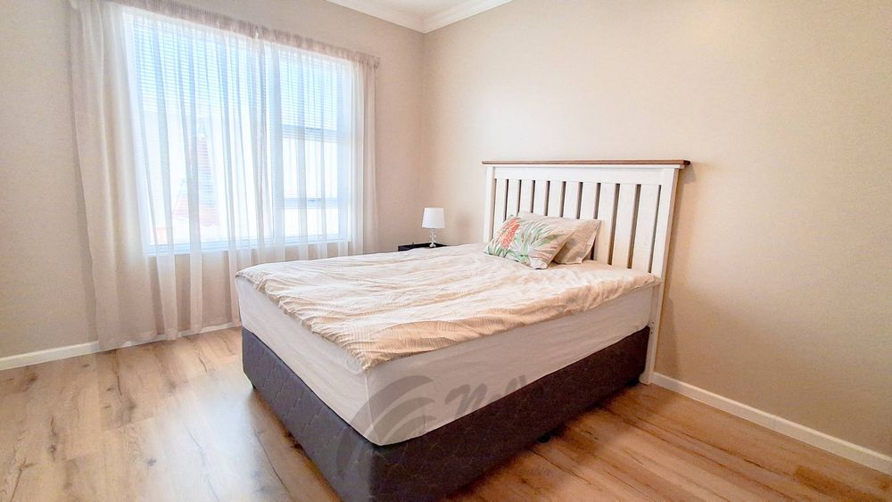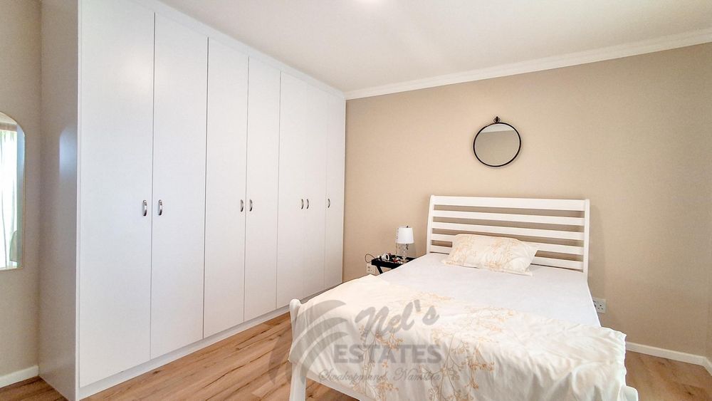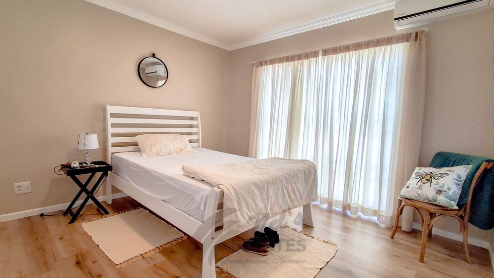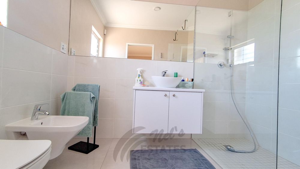 The home offers two well-proportioned bedrooms, both with en-suite bathrooms. The main bedroom includes air conditioning and a built-in safe, while the guest bedroom also enjoys its own en-suite. Additional linen cupboards with an integrated safe provide extra storage and security.