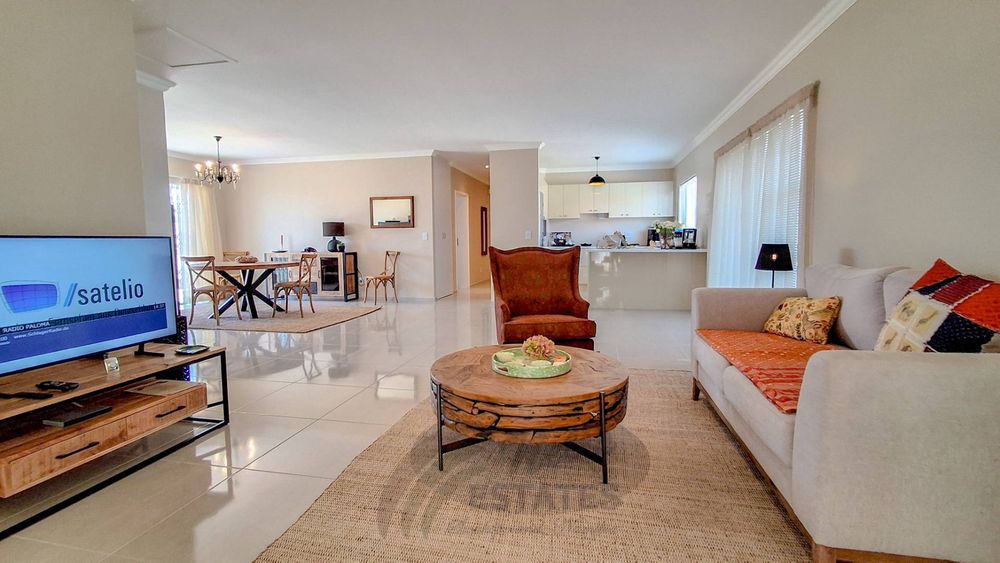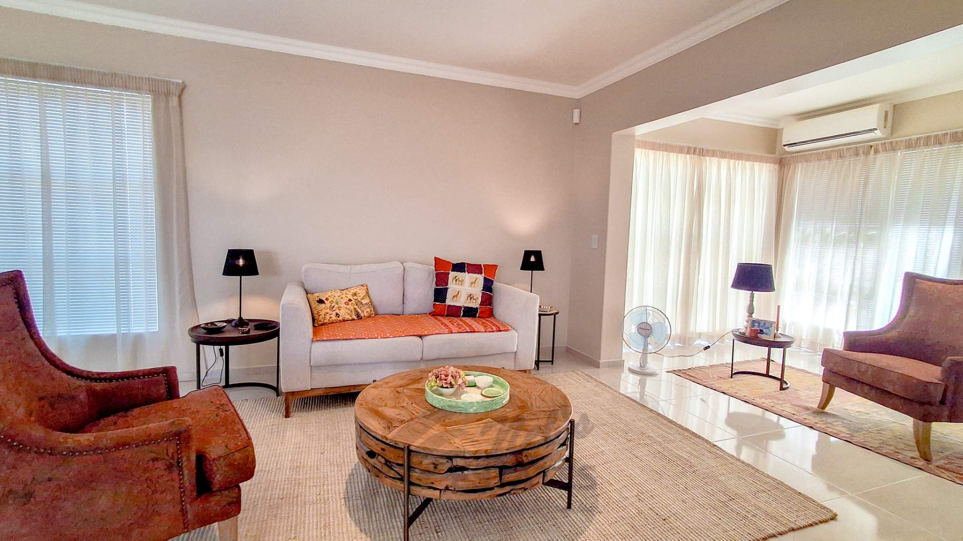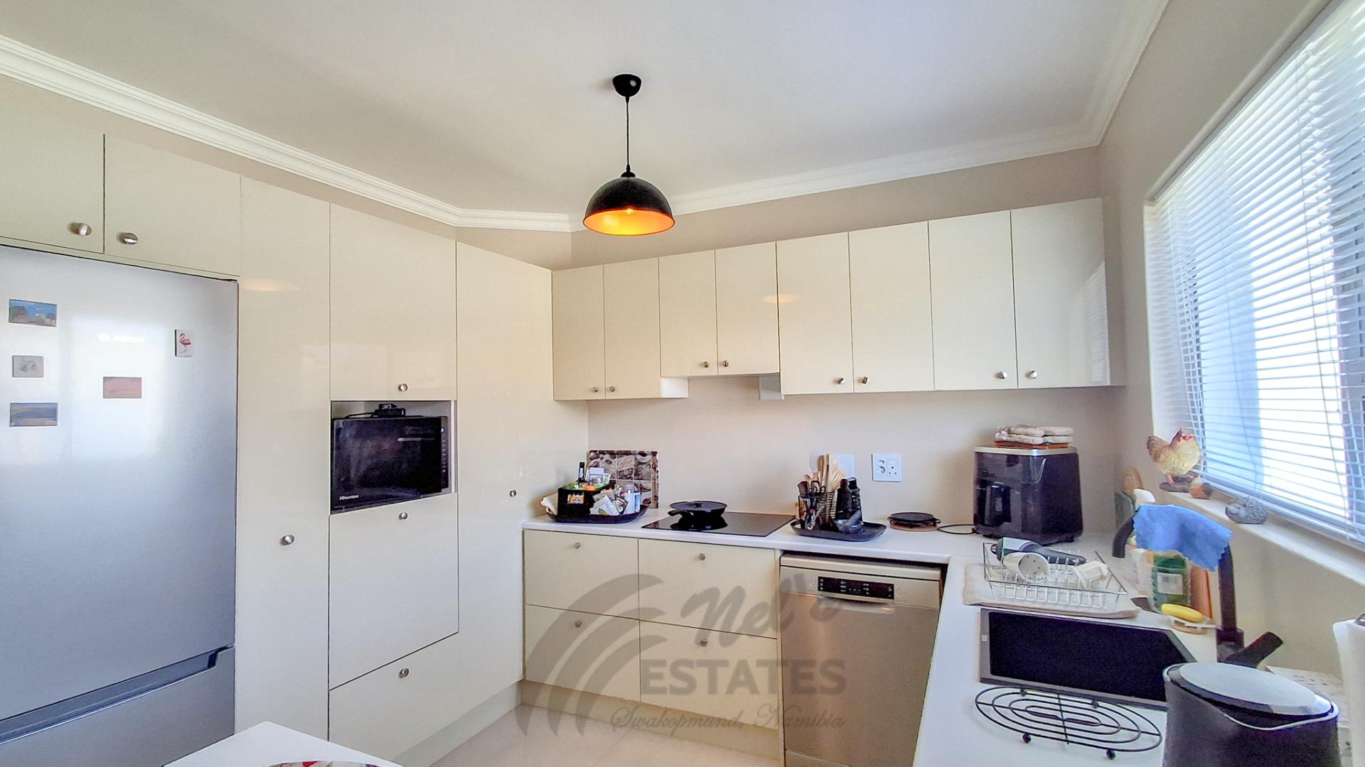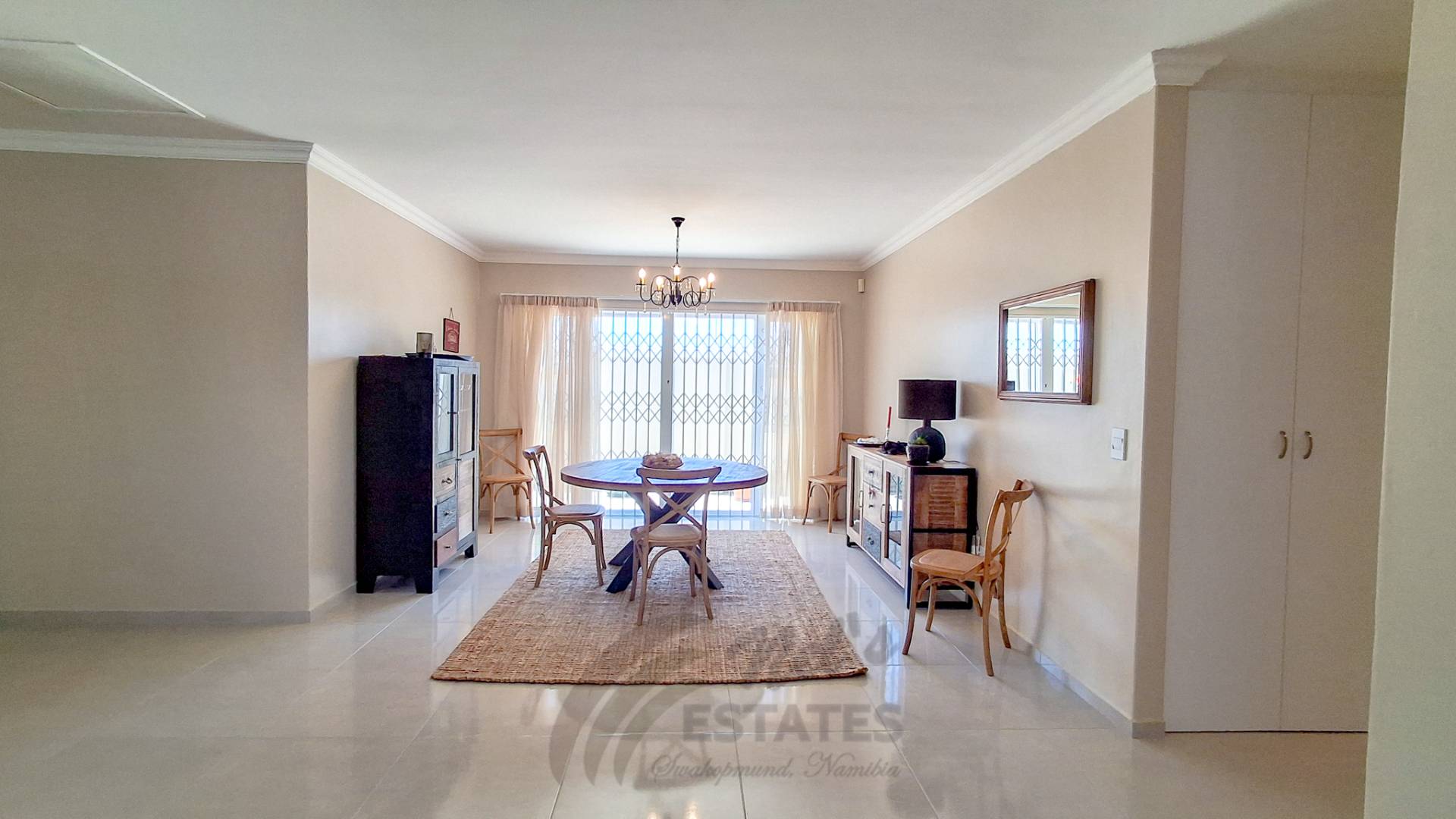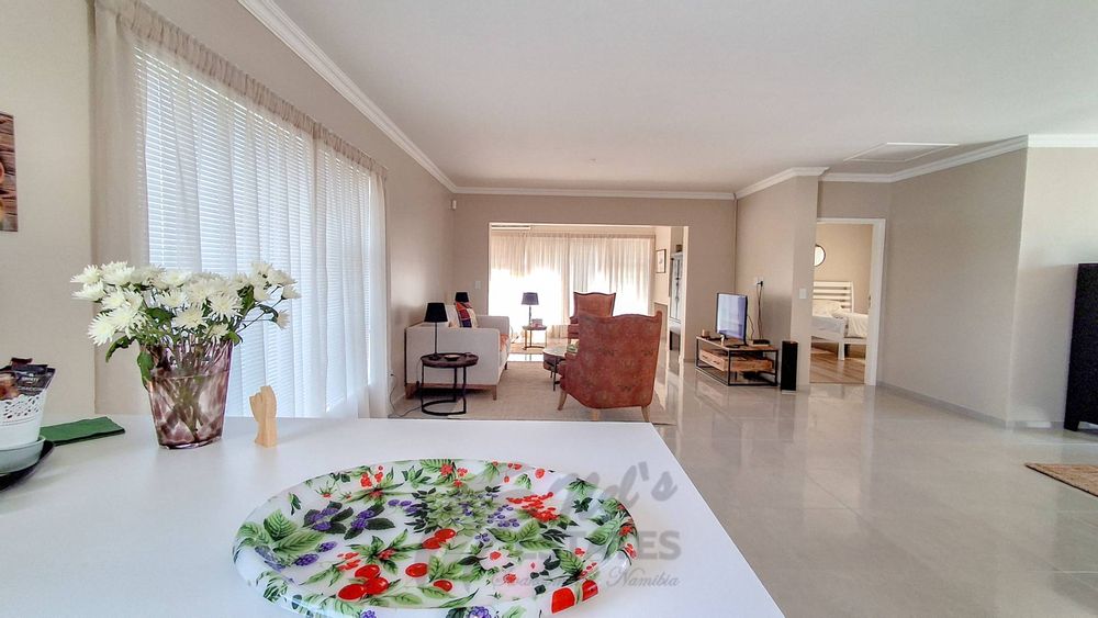 The home offers two well-proportioned bedrooms, both with en-suite bathrooms. The main bedroom includes air conditioning and a built-in safe, while the guest bedroom also enjoys its own en-suite. Additional linen cupboards with an integrated safe provide extra storage and security.