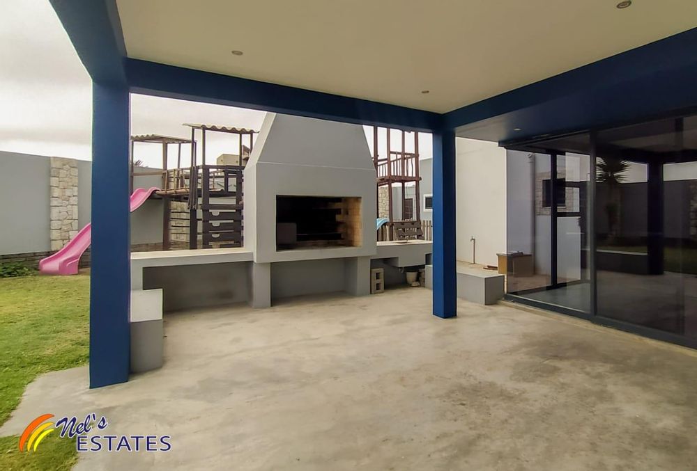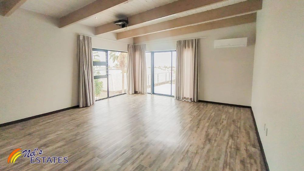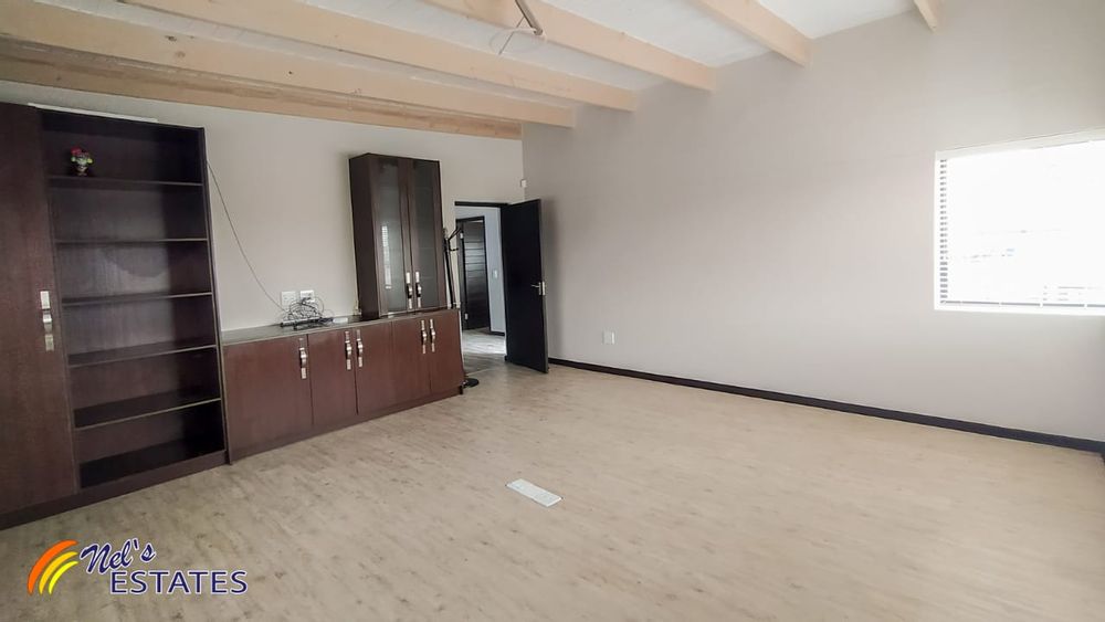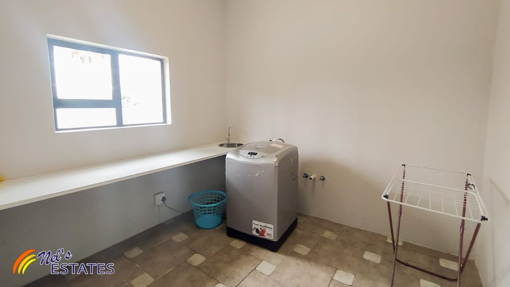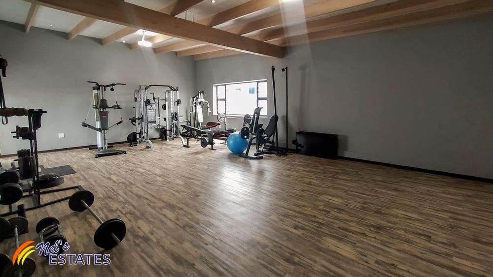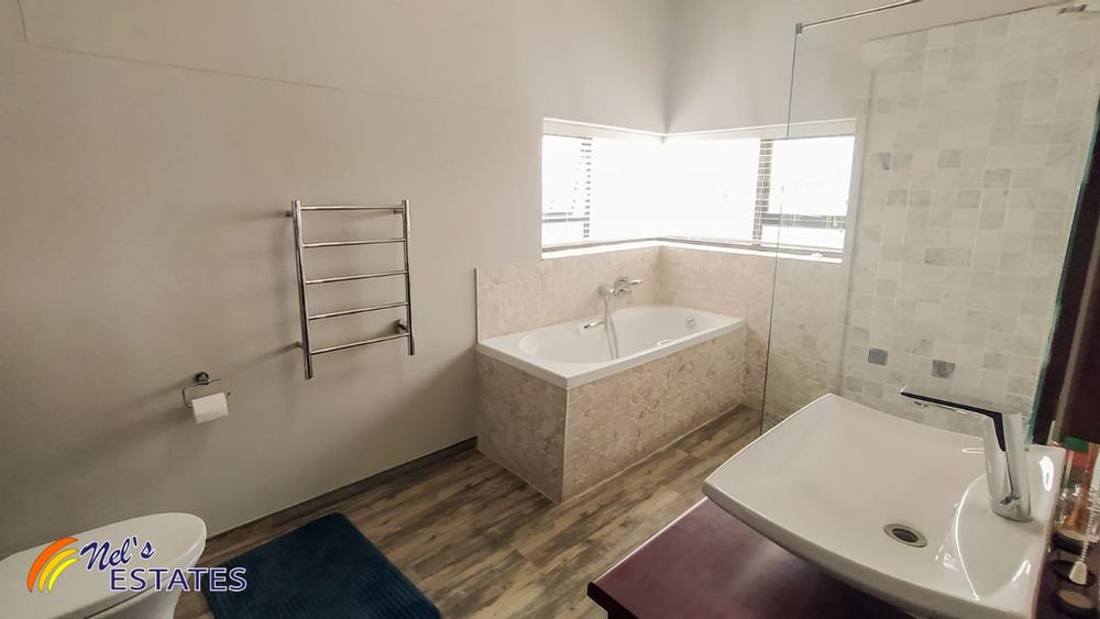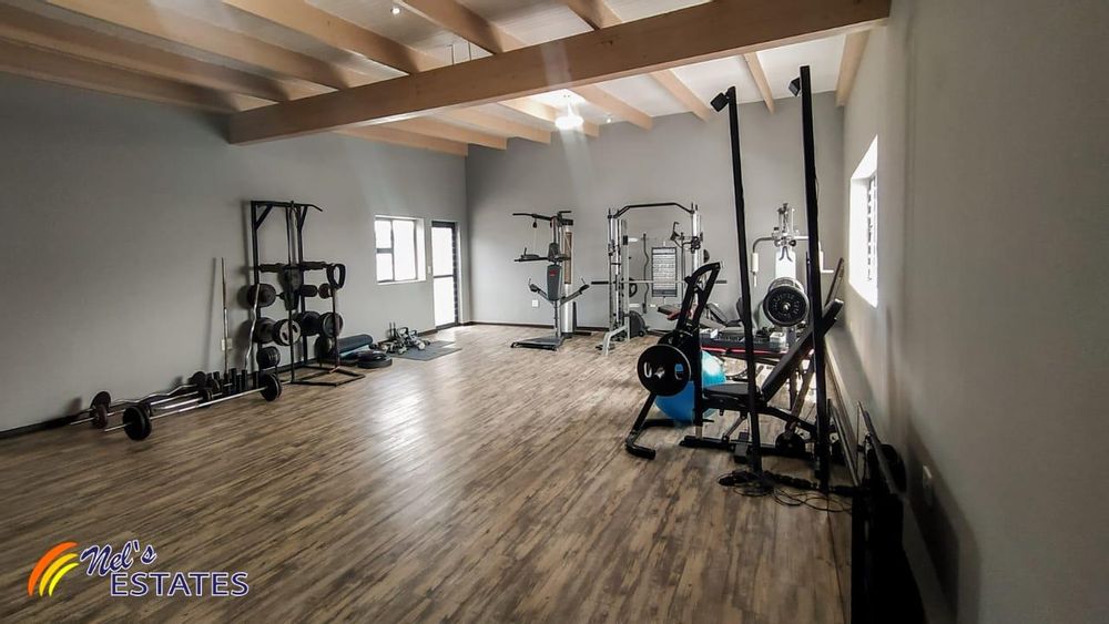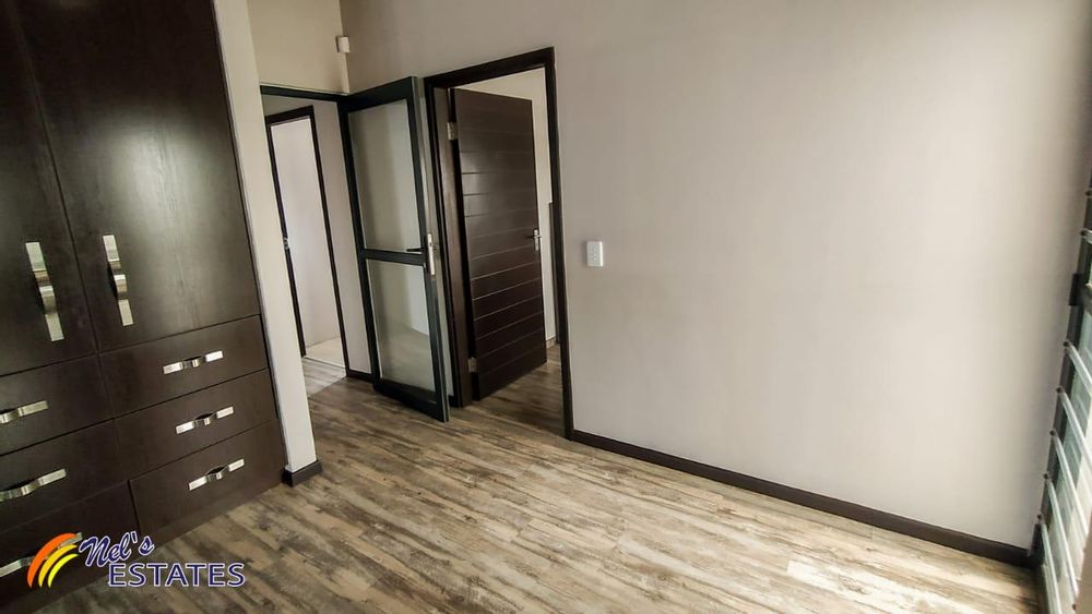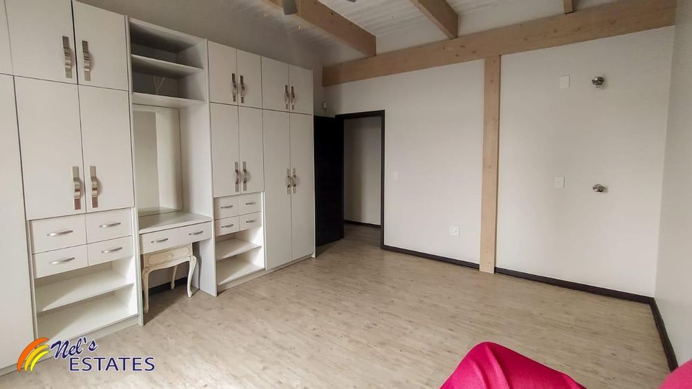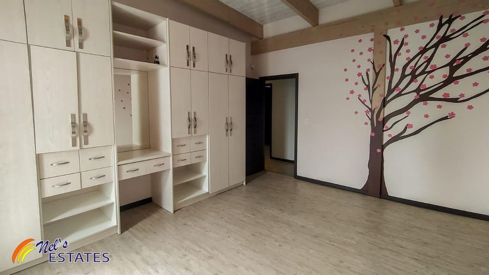 Additional features include an alarm system and outdoor security beams, underfloor heating, a solar geyser, and an irrigation system installed in the garden.
