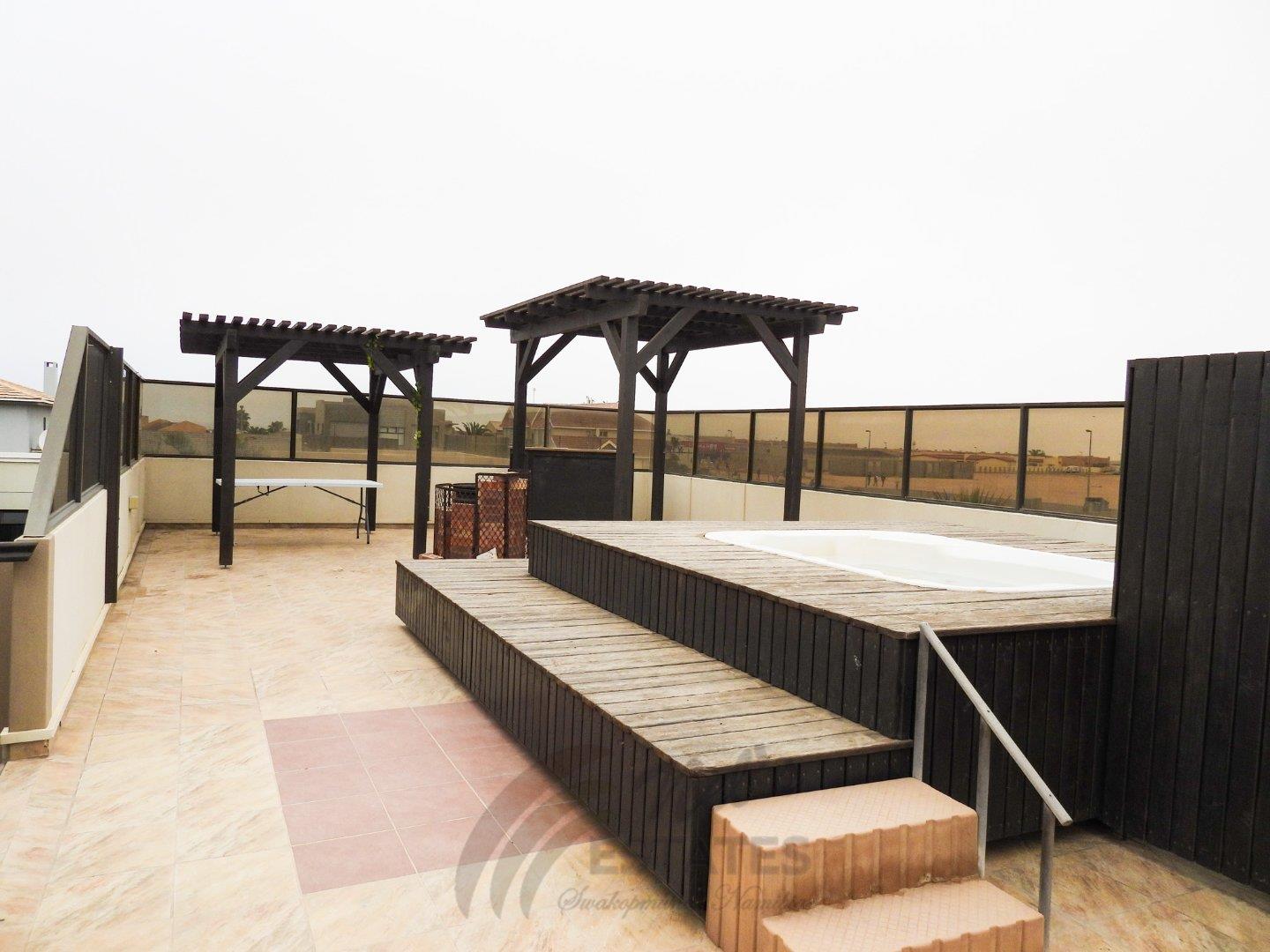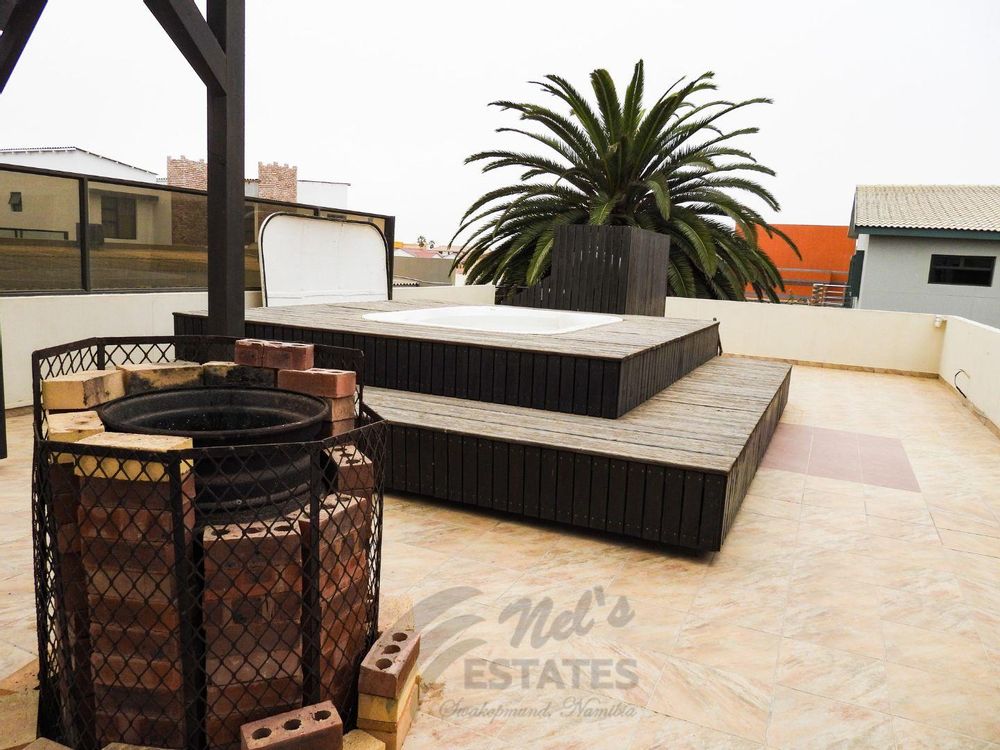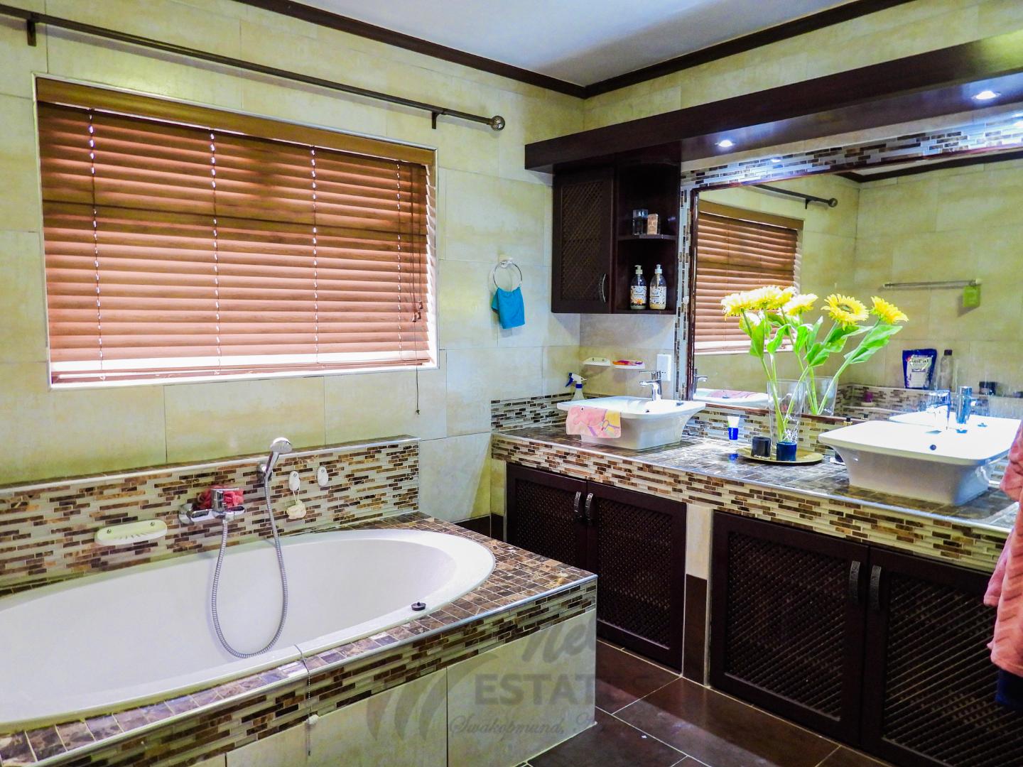 The spacious kitchen is a chef's dream, complete with a gas hob and breakfast counter. A separate scullery adds practicality, while the laundry/playroom with sliding doors to the garden offers versatility. Step outside to the beautiful sun deck with a jacuzzi, perfect for unwinding in style.