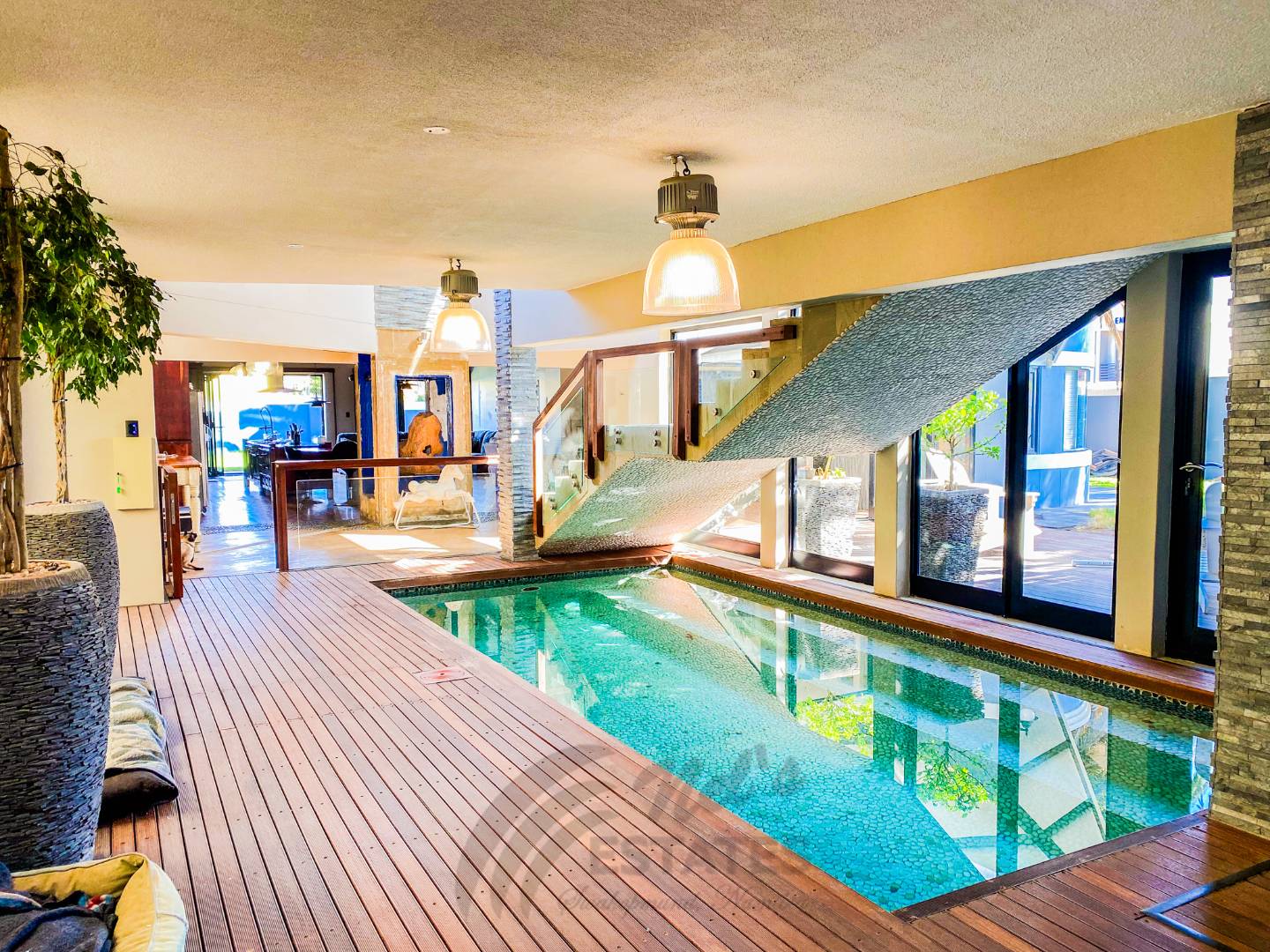 Discover the perfect blend of convenience and luxury in this stunning home, ideally located within walking distance of the town's vibrant amenities and services. Step inside to be greeted by an inviting open plan layout, seamlessly connecting the entrance foyer, lounge, and dining room. The spacious kitchen is a chef's delight, featuring granite countertops, a gas hob, and a separate scullery for added convenience. A cozy TV lounge offers a retreat for relaxation, while an indoor swimming pool and pool hall provide the perfect space for leisure and entertainment.