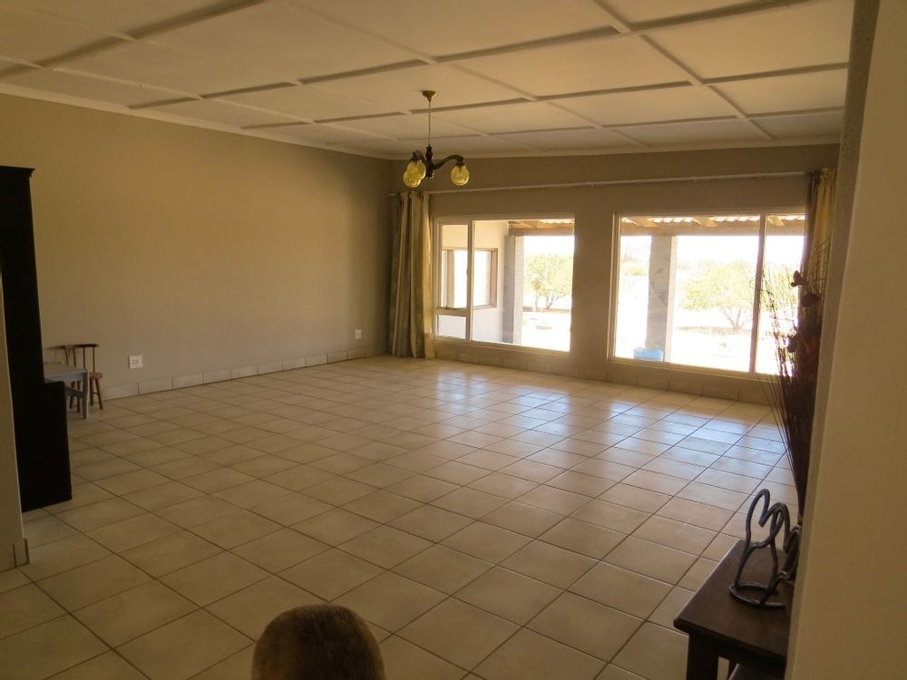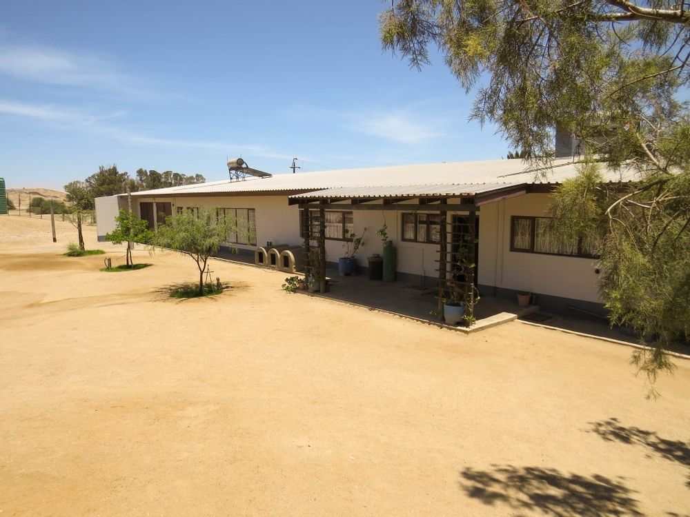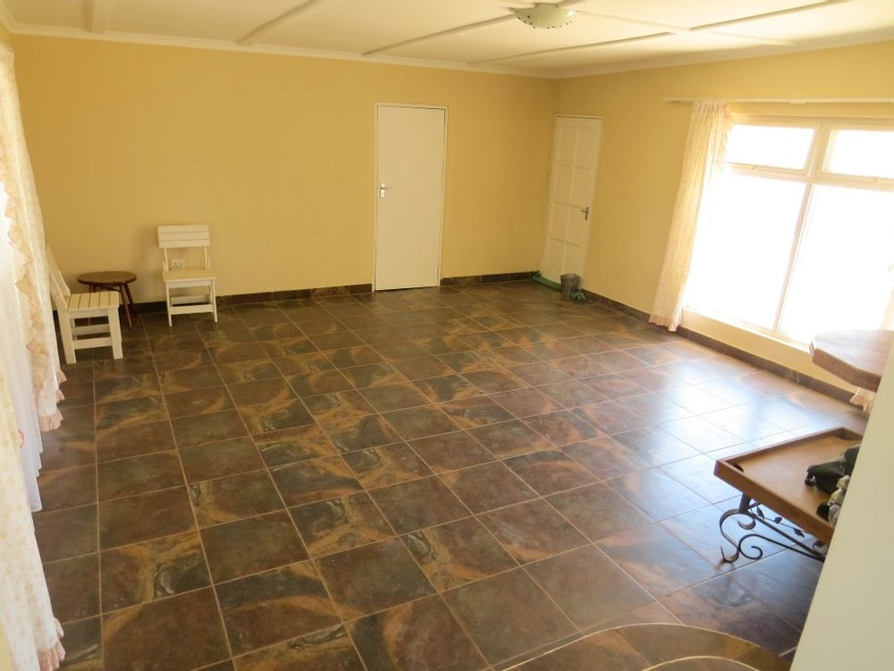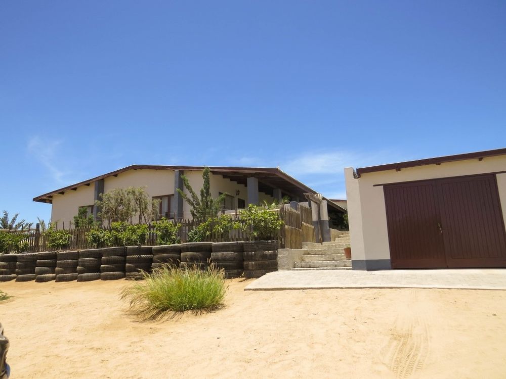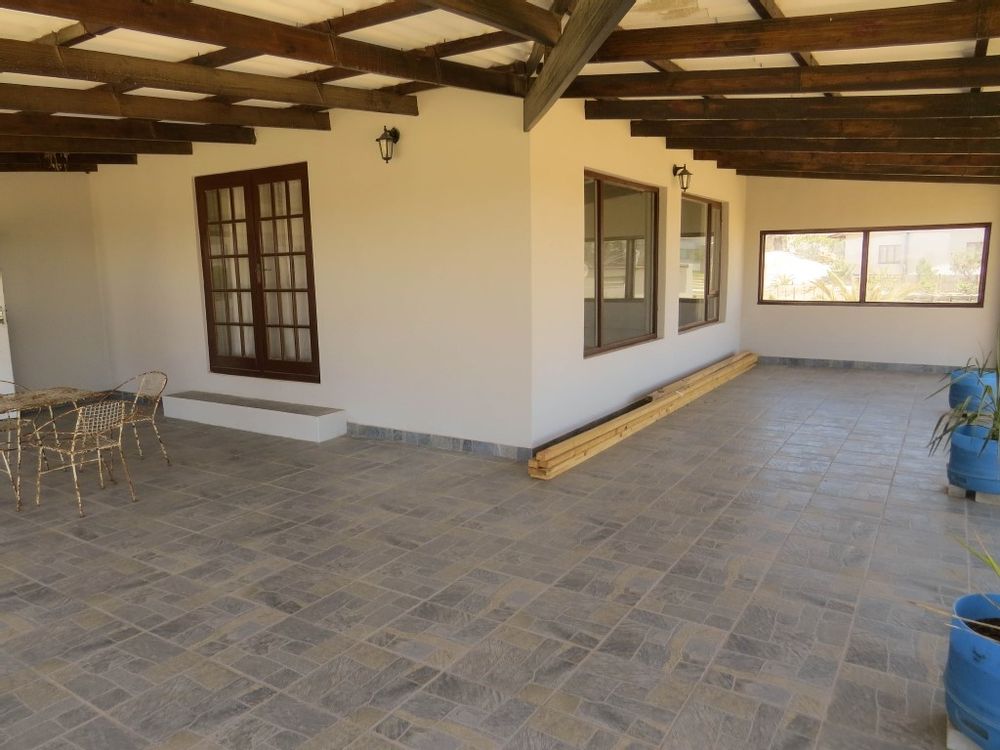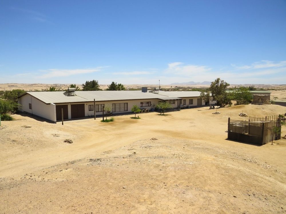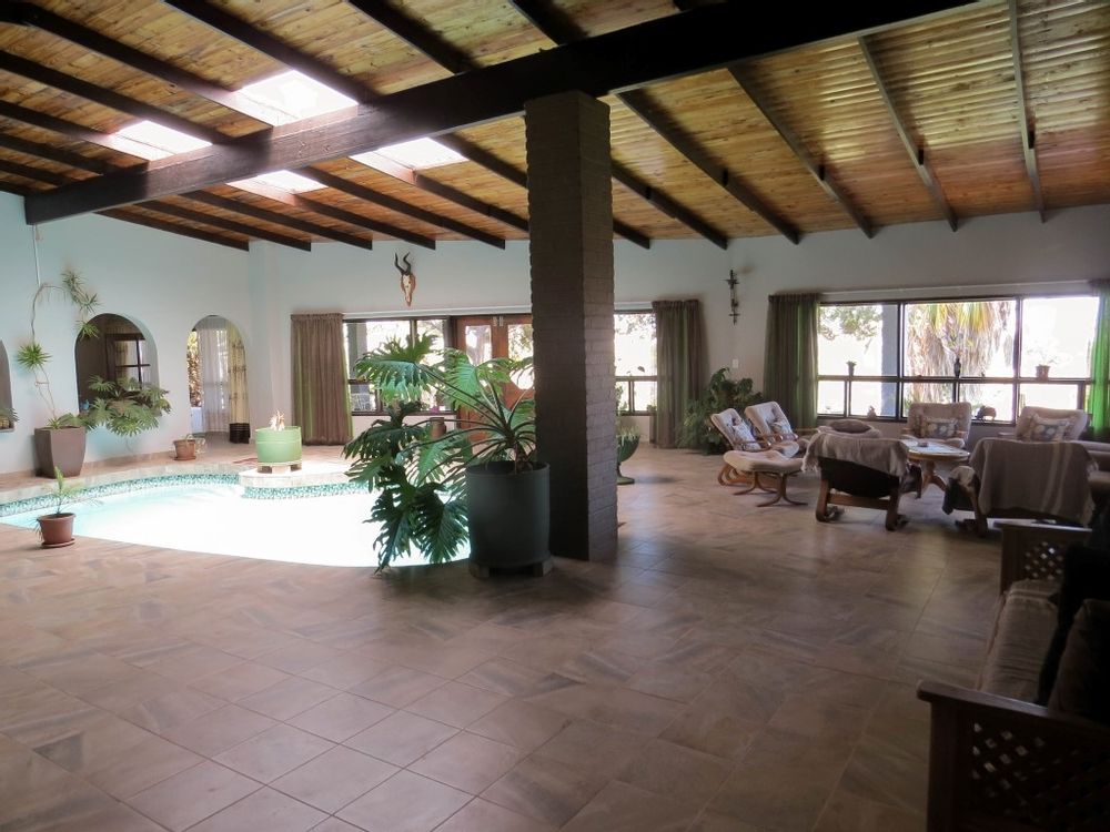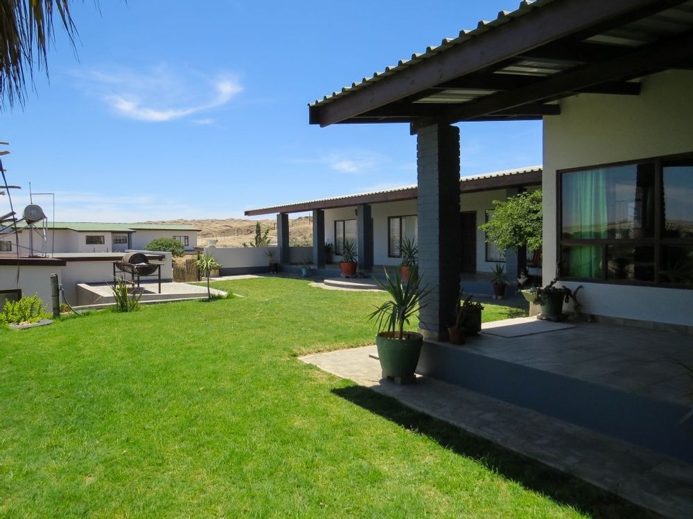 The main house is a five bedroom house with 4 bathrooms, beautiful kitchen, with scullery, pantry / washing area , dining area and living area ,TV room, lovely enclosed entertainment area with a swimmping pool, indoor BBQ, enough space for extra table and chairs to serve meal to guests ,4 garages, swimming pool , study and a very big lovely outside veranda , with a great view over the Swakop River. The house size is 1 225 m2.