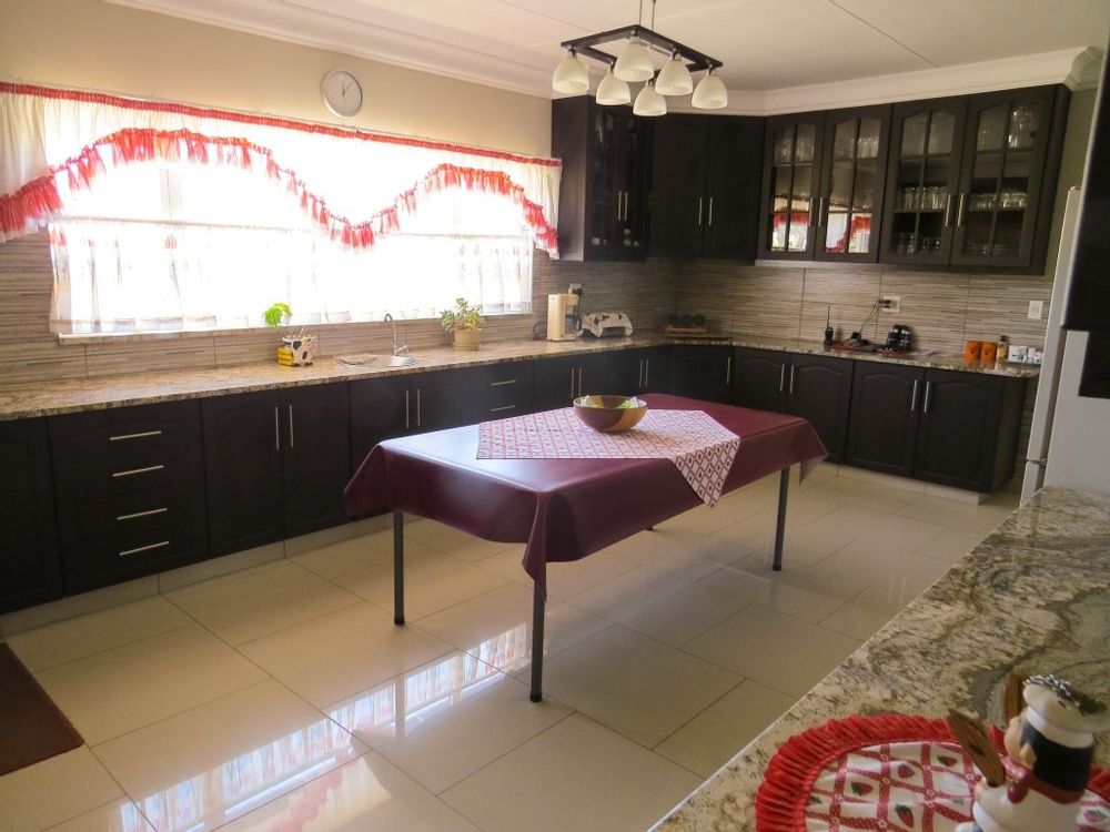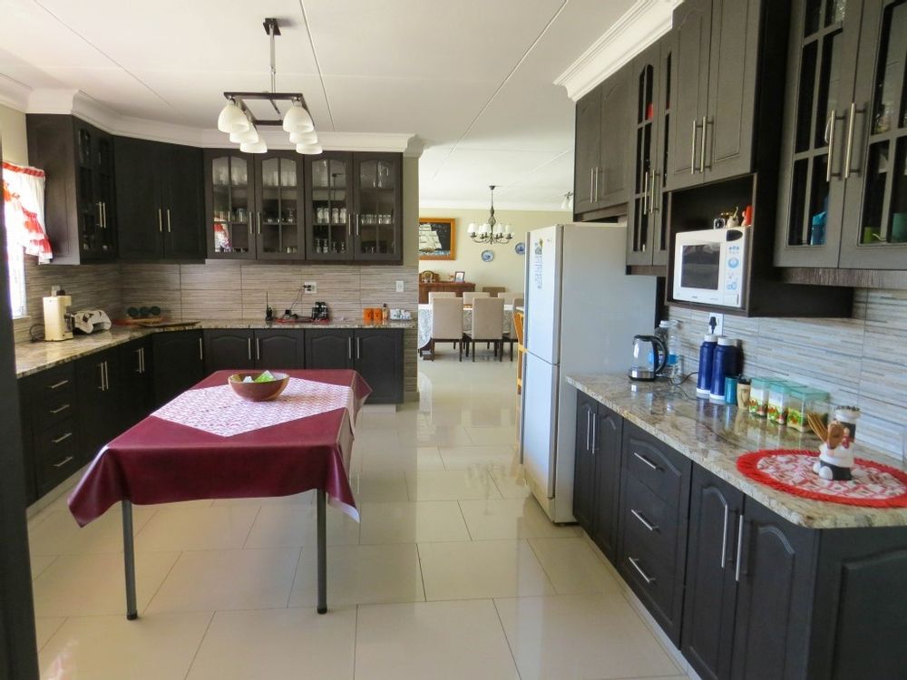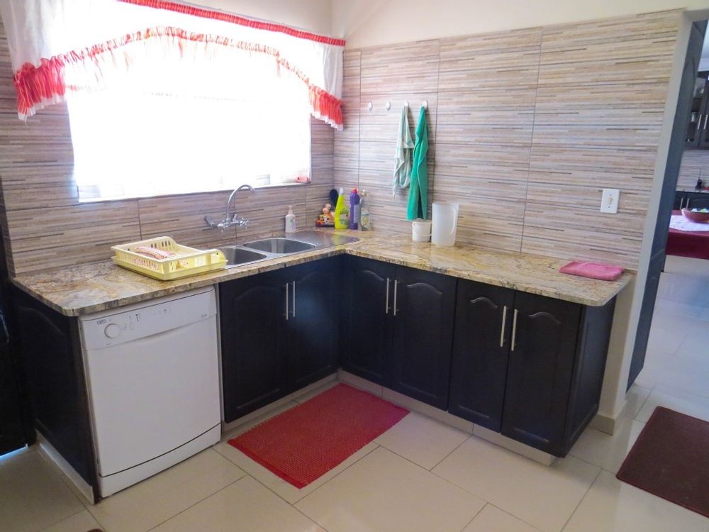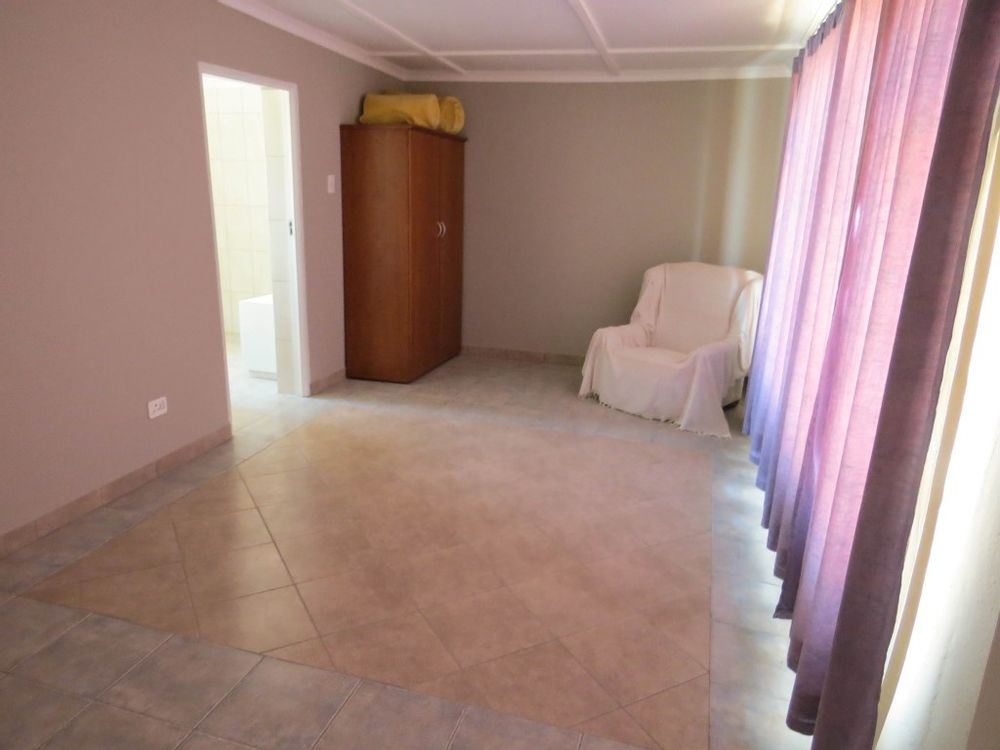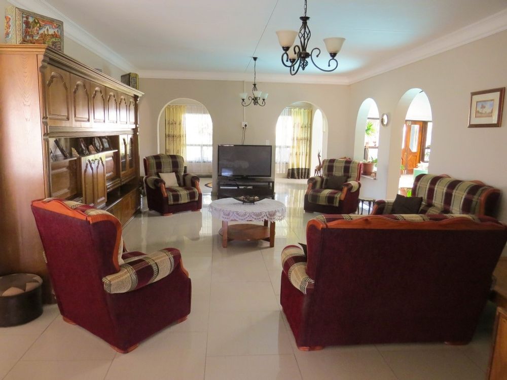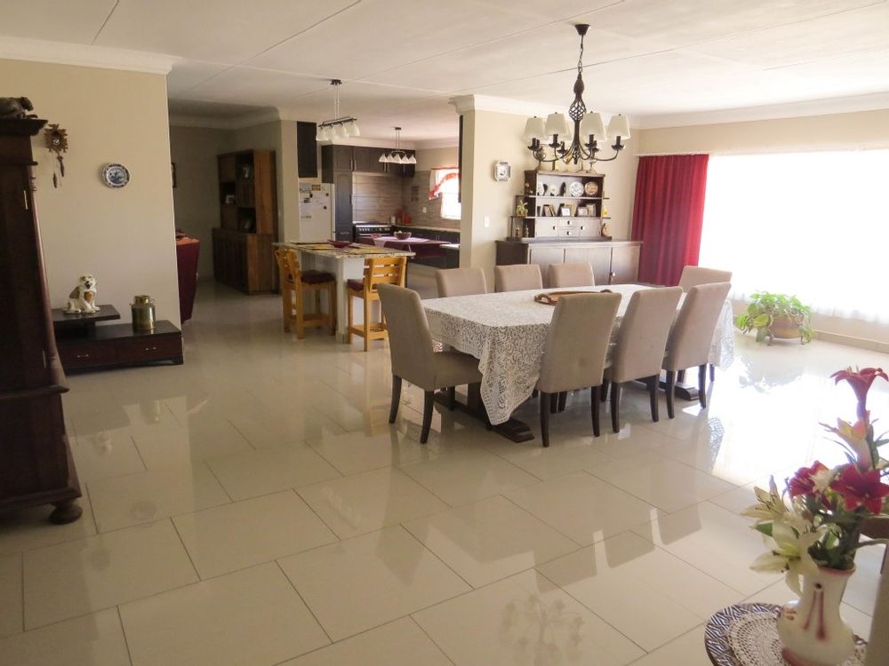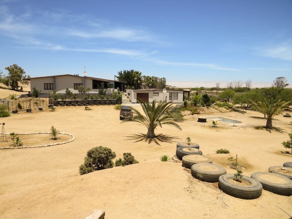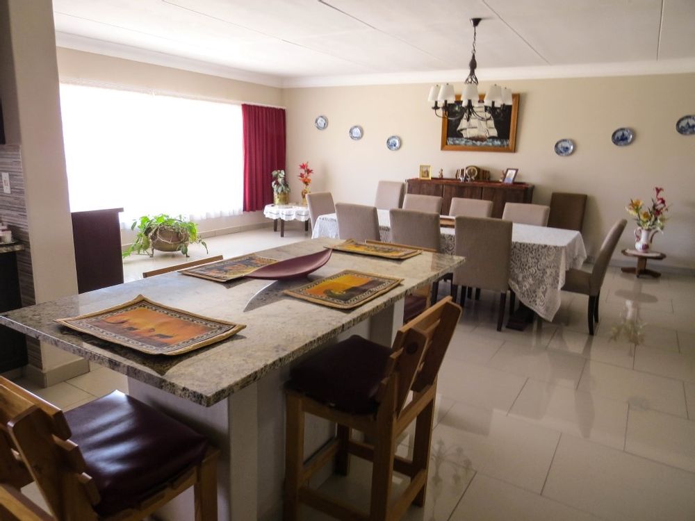 The main house is a five bedroom house with 4 bathrooms, beautiful kitchen, with scullery, pantry / washing area , dining area and living area ,TV room, lovely enclosed entertainment area with a swimmping pool, indoor BBQ, enough space for extra table and chairs to serve meal to guests ,4 garages, swimming pool , study and a very big lovely outside veranda , with a great view over the Swakop River. The house size is 1 225 m2.