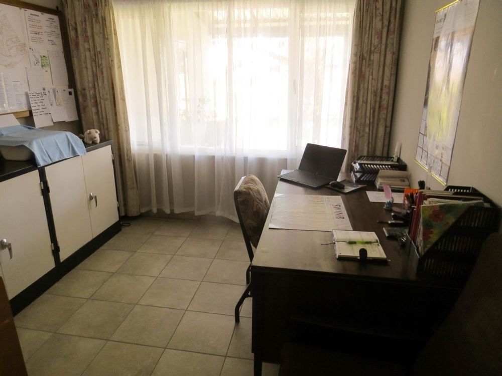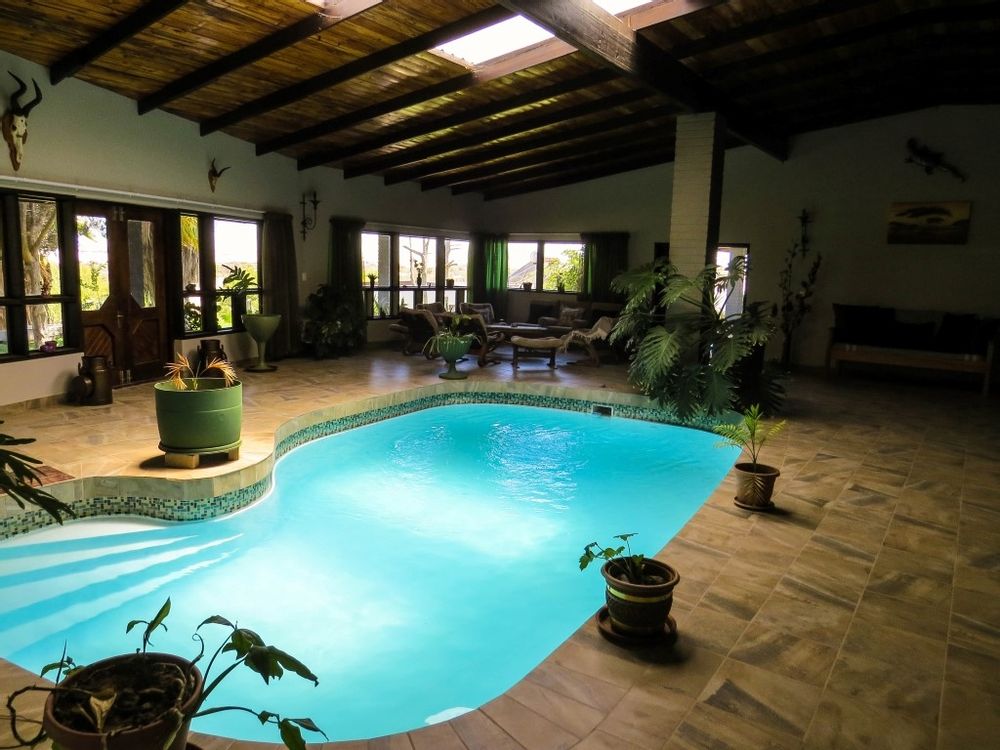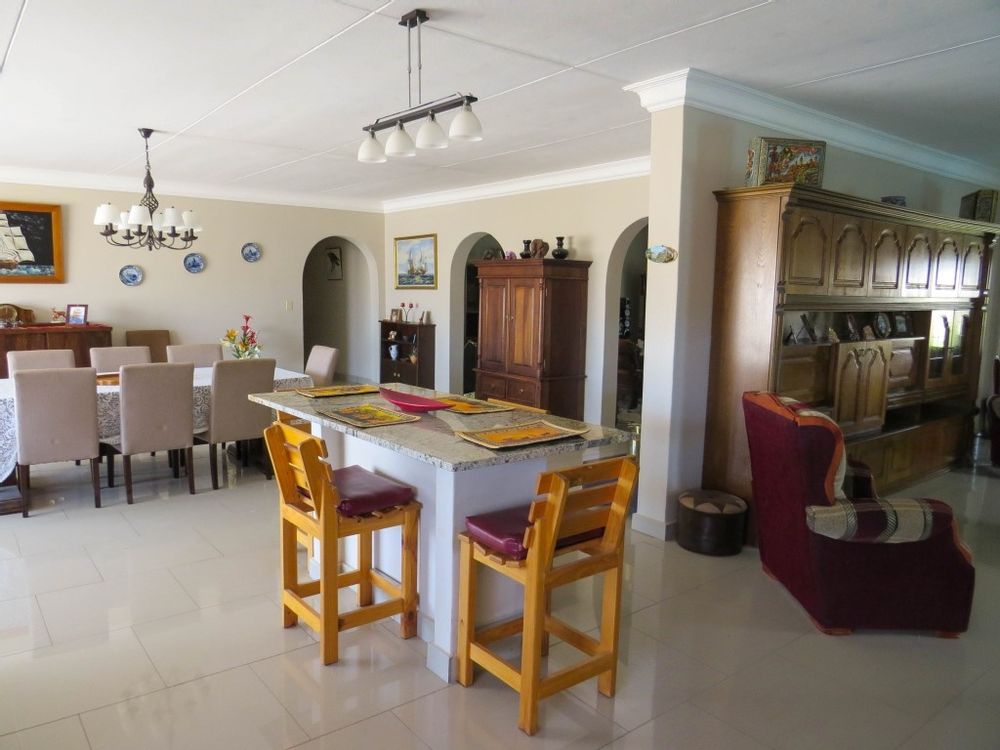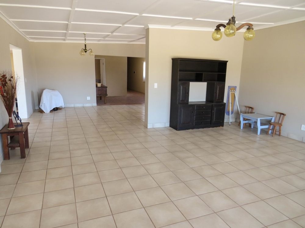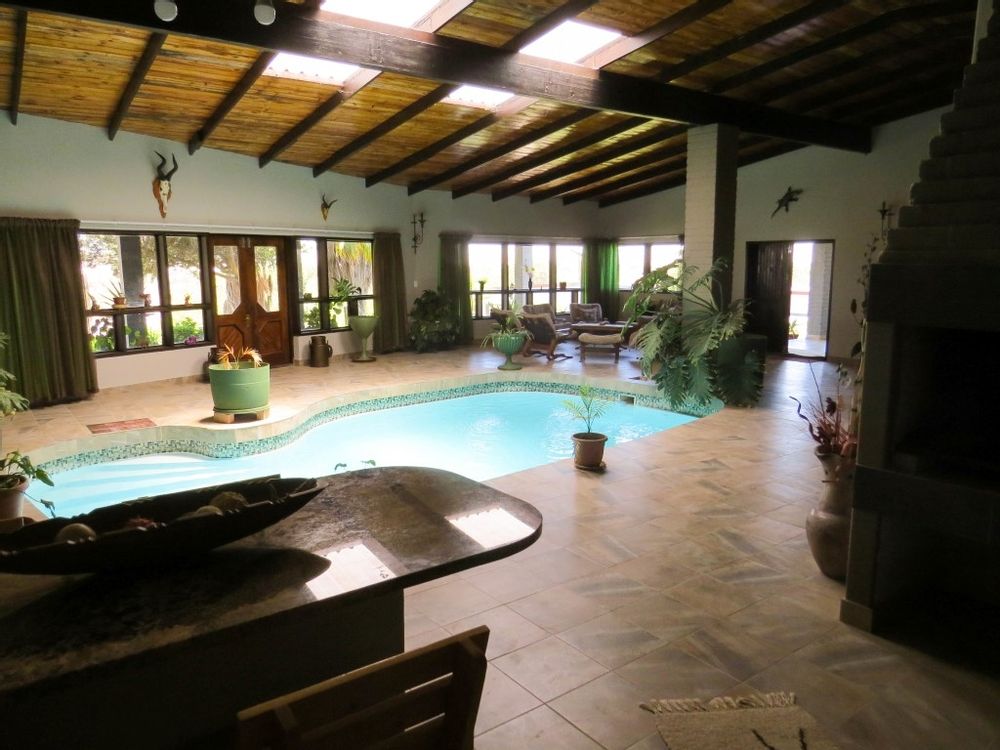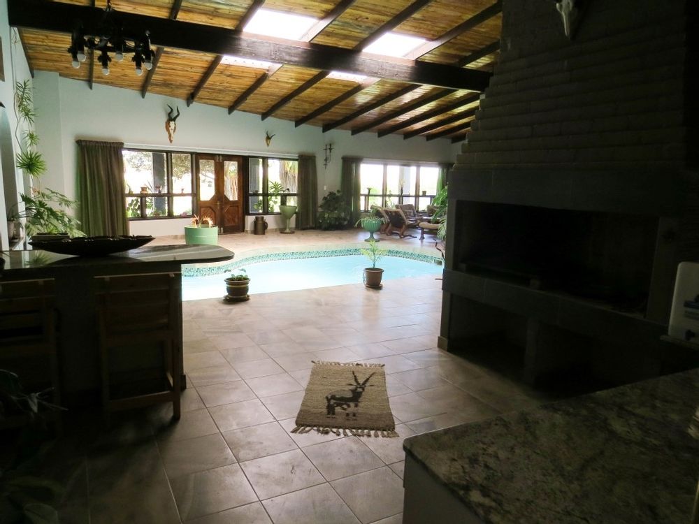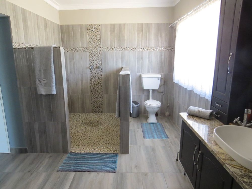The main house is a five bedroom house with 4 bathrooms, beautiful kitchen, with scullery, pantry / washing area , dining area and living area ,TV room, lovely enclosed entertainment area with a swimmping pool, indoor BBQ, enough space for extra table and chairs to serve meal to guests ,4 garages, swimming pool , study and a very big lovely outside veranda , with a great view over the Swakop River. The house size is 1 225 m2.