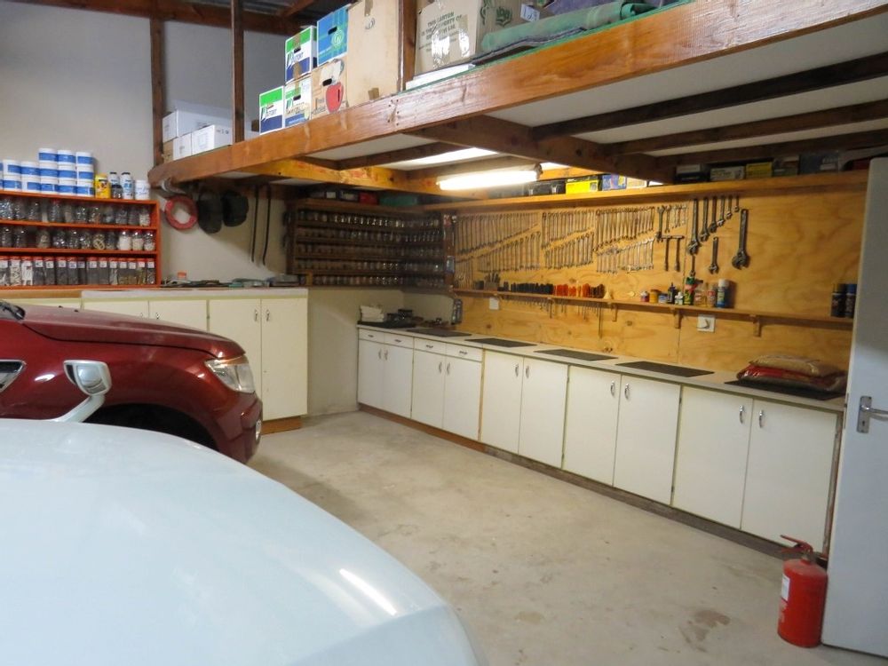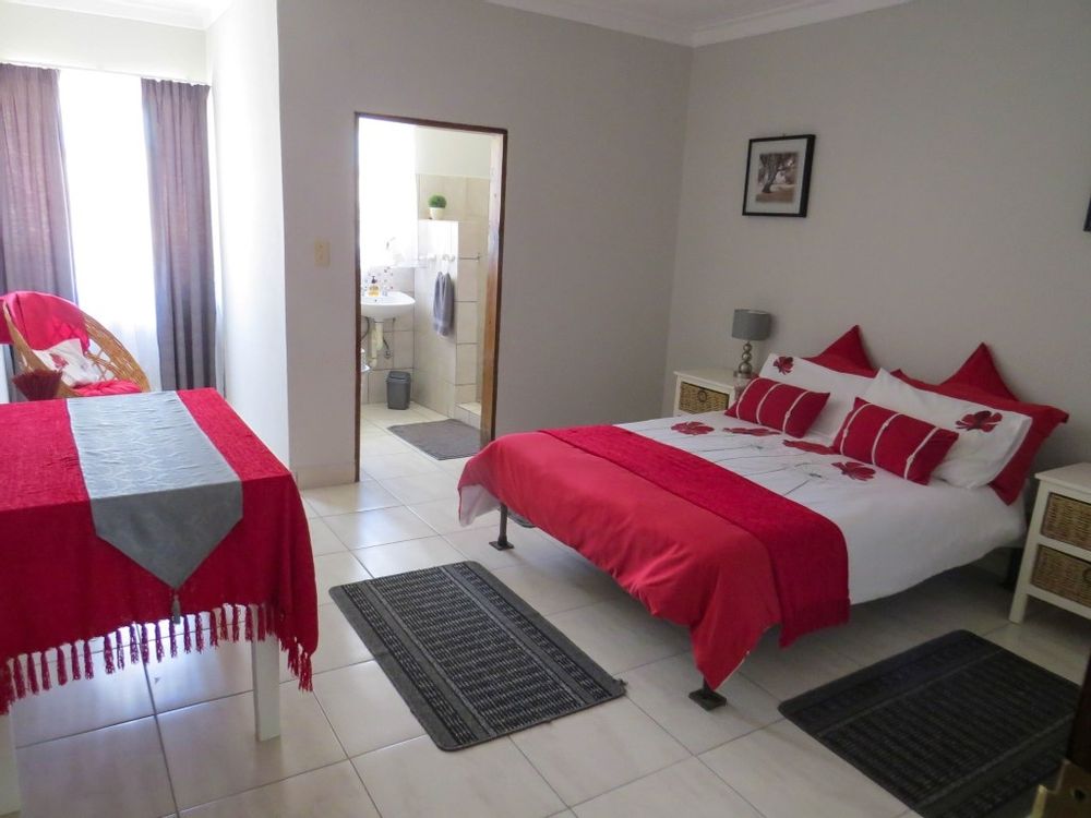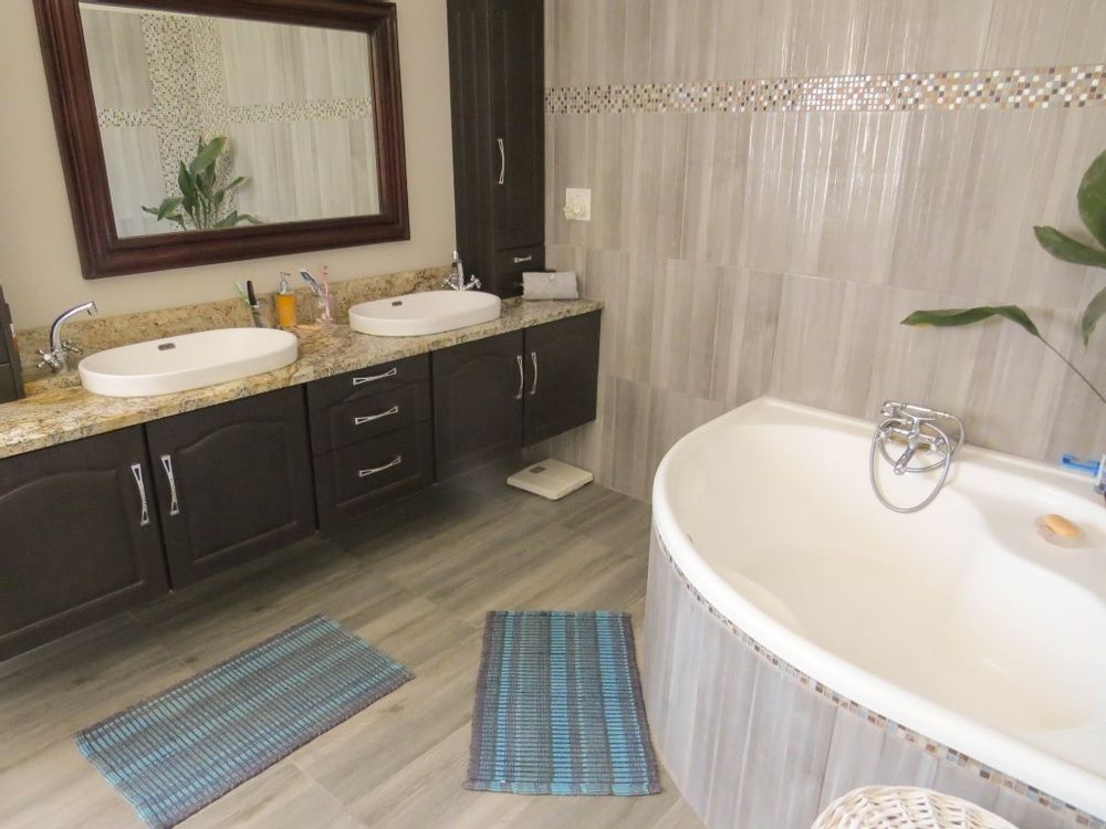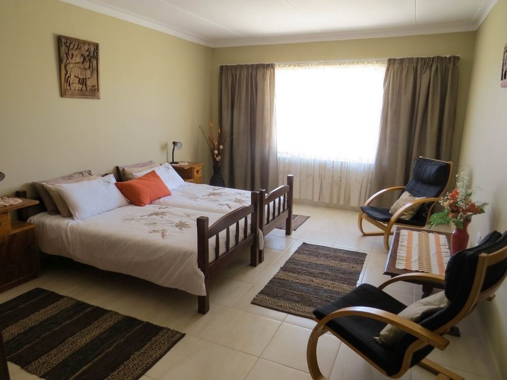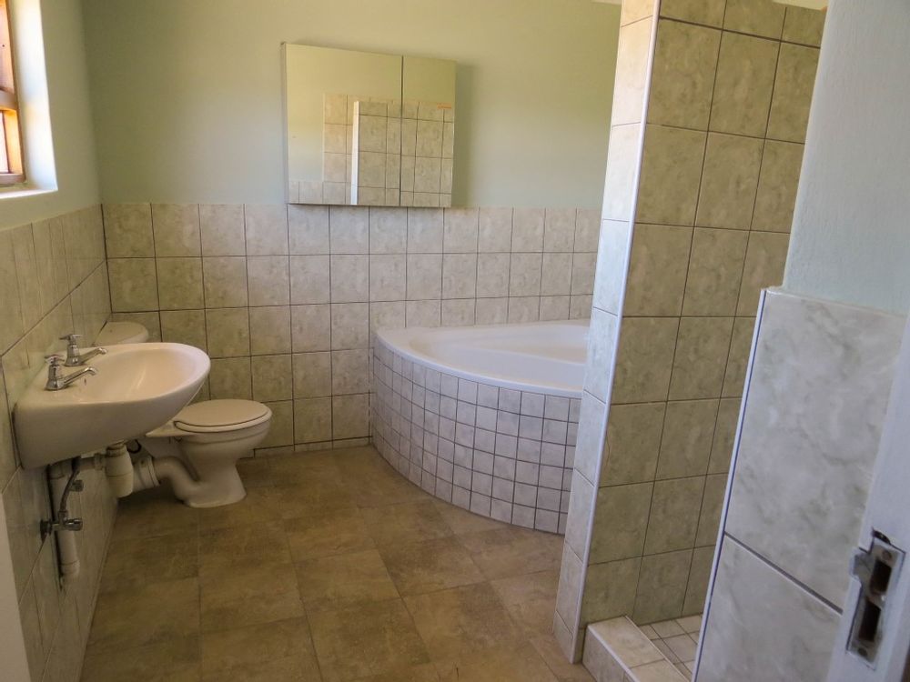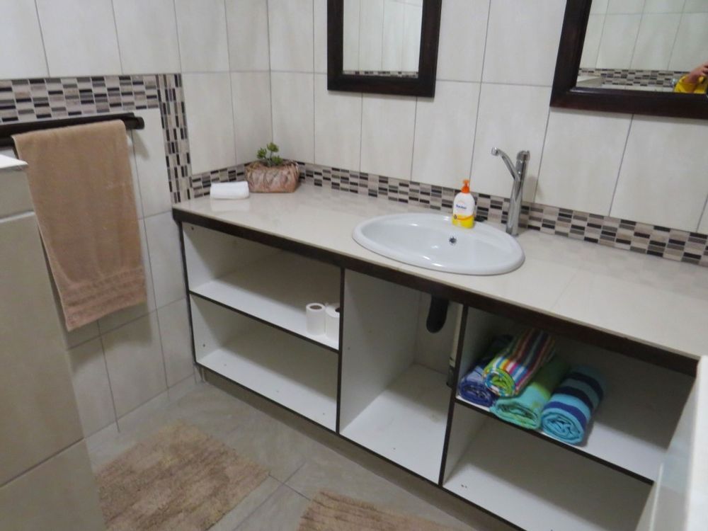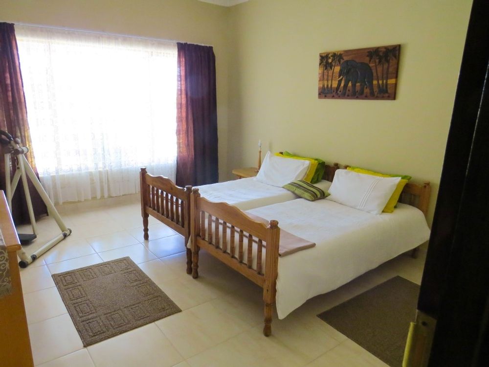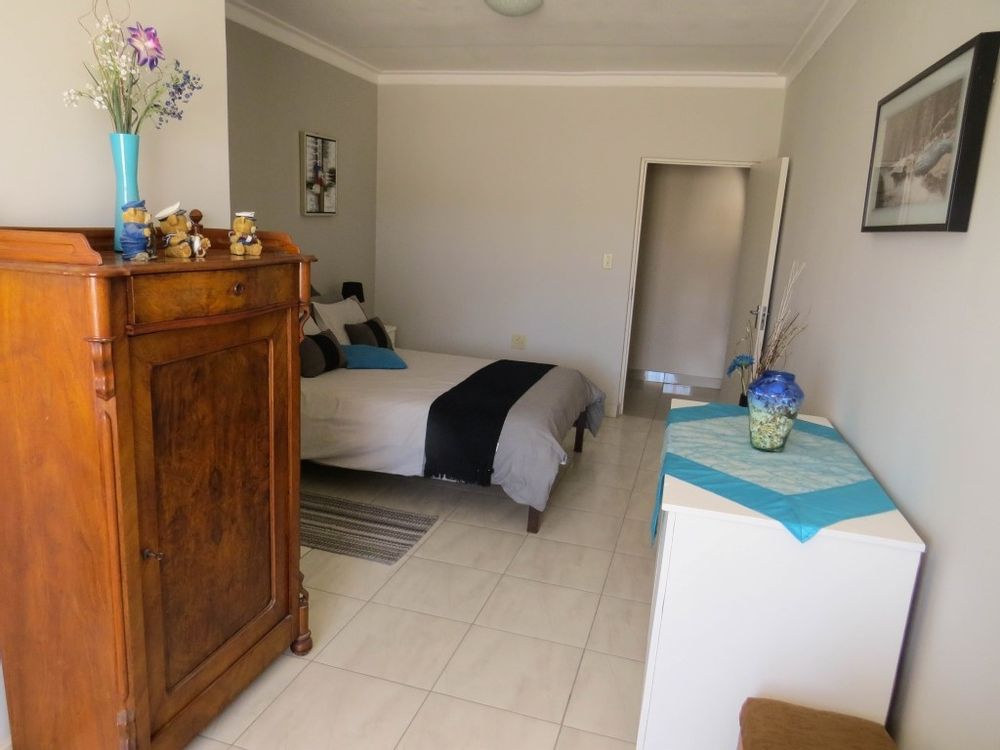 The main house is a five bedroom house with 4 bathrooms, beautiful kitchen, with scullery, pantry / washing area , dining area and living area ,TV room, lovely enclosed entertainment area with a swimmping pool, indoor BBQ, enough space for extra table and chairs to serve meal to guests ,4 garages, swimming pool , study and a very big lovely outside veranda , with a great view over the Swakop River. The house size is 1 225 m2.
