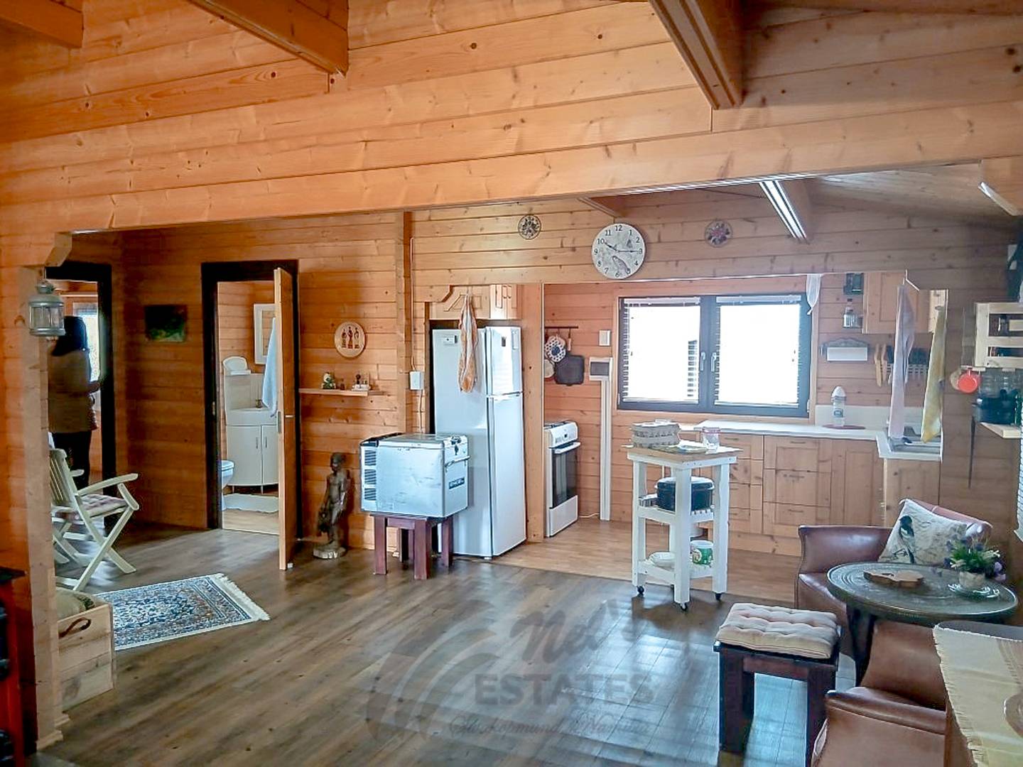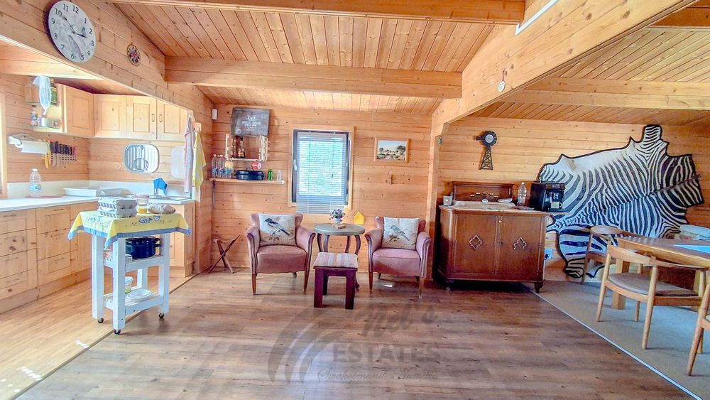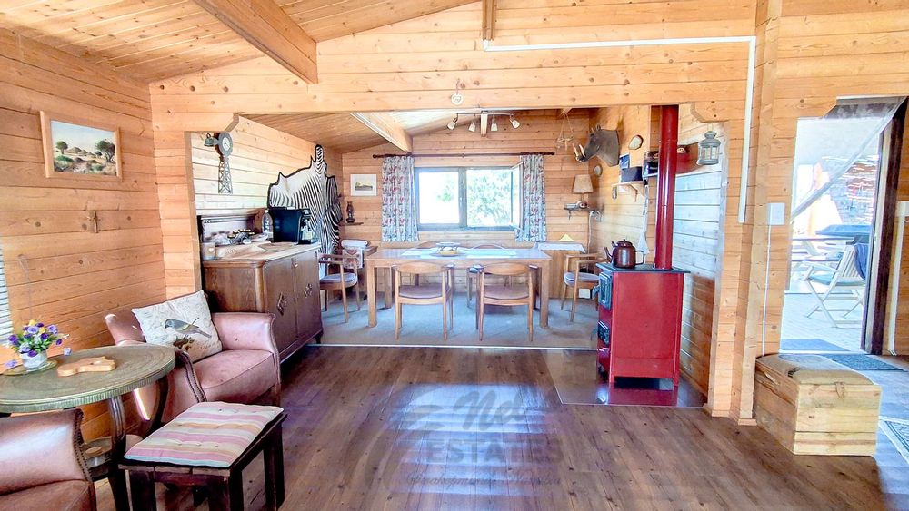 The stylish imported German wooden house boasts double-glazed “Kippfenster” windows, top-tier safety features, a Kamino fireplace, and secure doors & lighting systems.