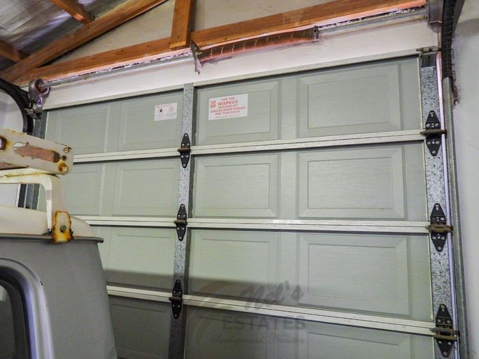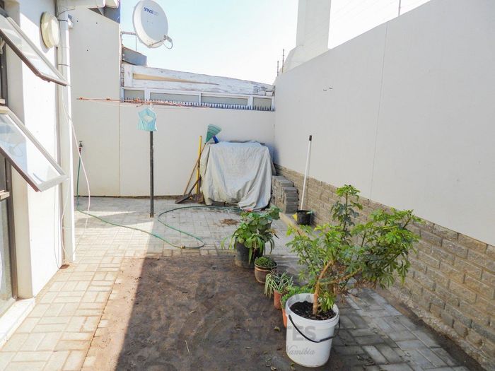 Secure complex living with high walls and remote gate access, private courtyard off second bedroom, breakfast-counter kitchen, small garden area, single garage with water connection — two beds, one bath.