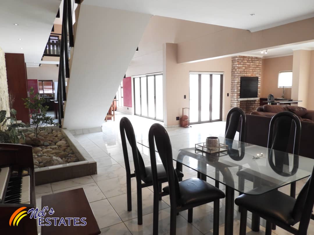The dining area seamlessly flows out onto a patio that leads to an outdoor BBQ area, ideal for hosting gatherings and enjoying al fresco dining. Inside, you'll find an indoor BBQ, providing the perfect setting for year-round entertaining. The double volume lounge and living area are enhanced by an indoor water feature, creating a tranquil ambiance.