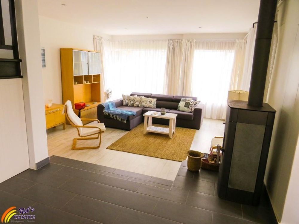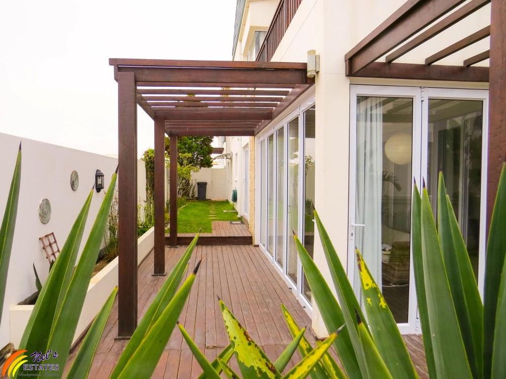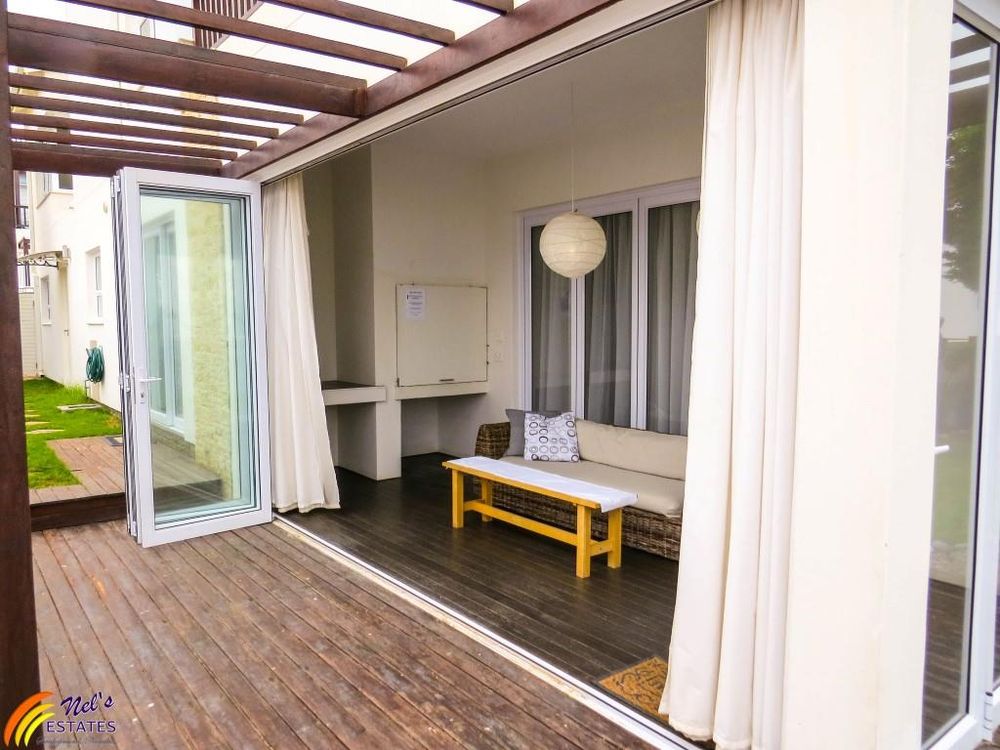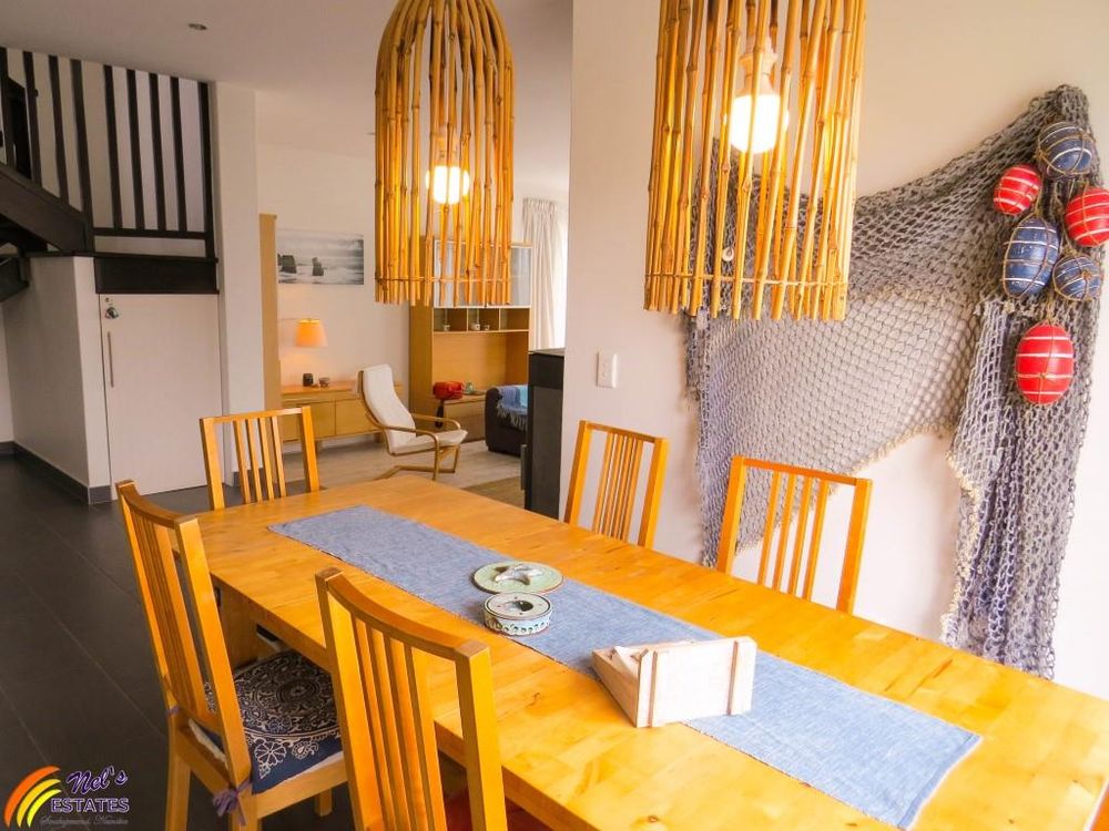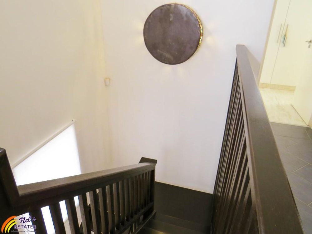 This townhouse has 3 bedrooms with 2 bathrooms. It has a guest toilet, an open-plan kitchen and living room with a sun room to the side and an indoor BBQ. There is a sauna room, outside deck, and a double garage. The unit also has a neat garden and an outside deck. There is a door on the second floor that leads to the flat roof that has amazing sea views. The main bedroom also has its own balcony with sea view.
