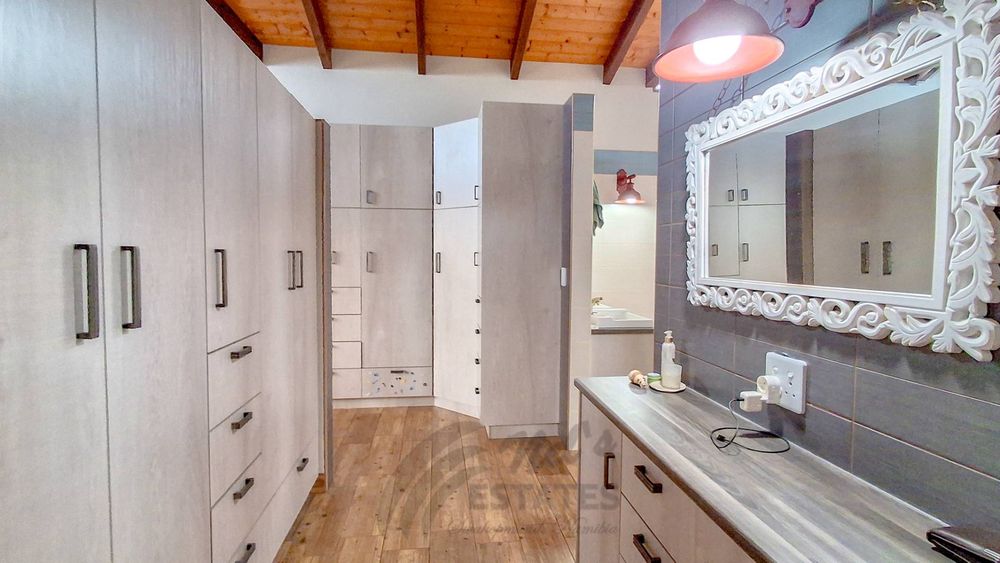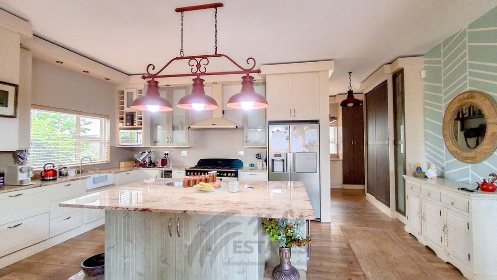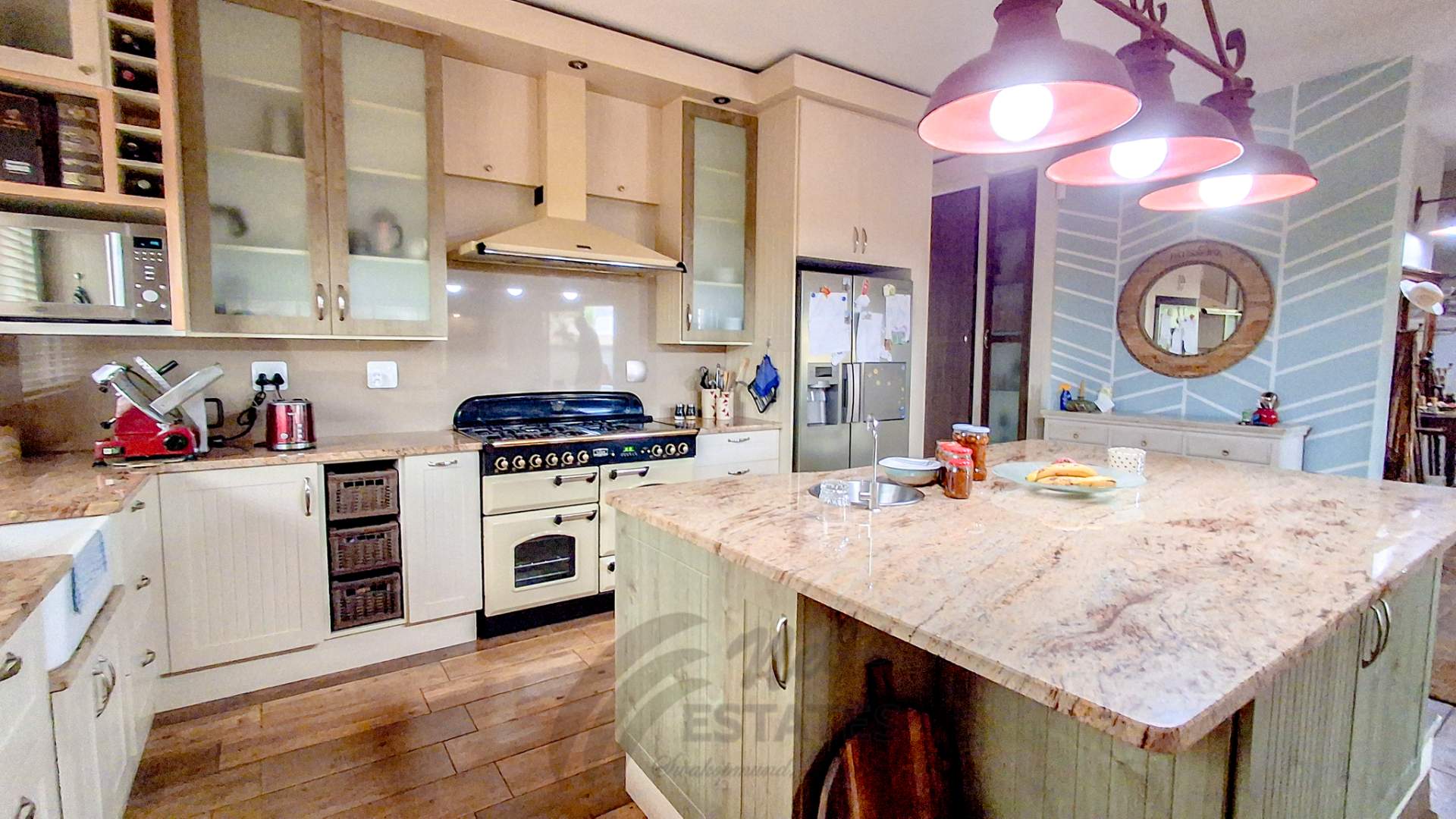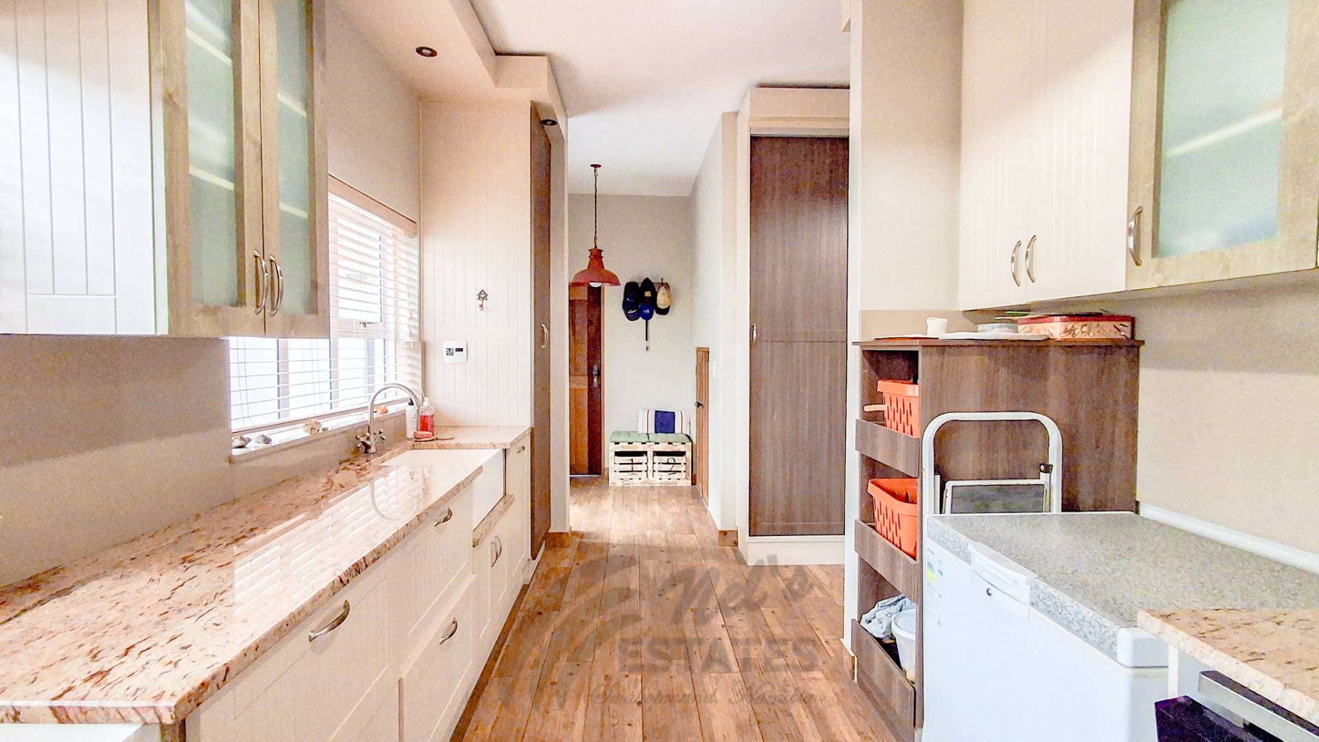 The heart of the home features a stunning open-plan kitchen with elegant granite countertops, a gas stove, and quality finishes throughout. A separate scullery leads directly to three garages – two for vehicles and a third ideal for tools or extra storage.