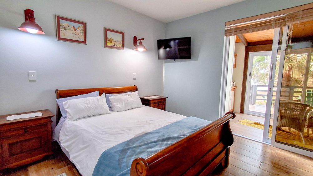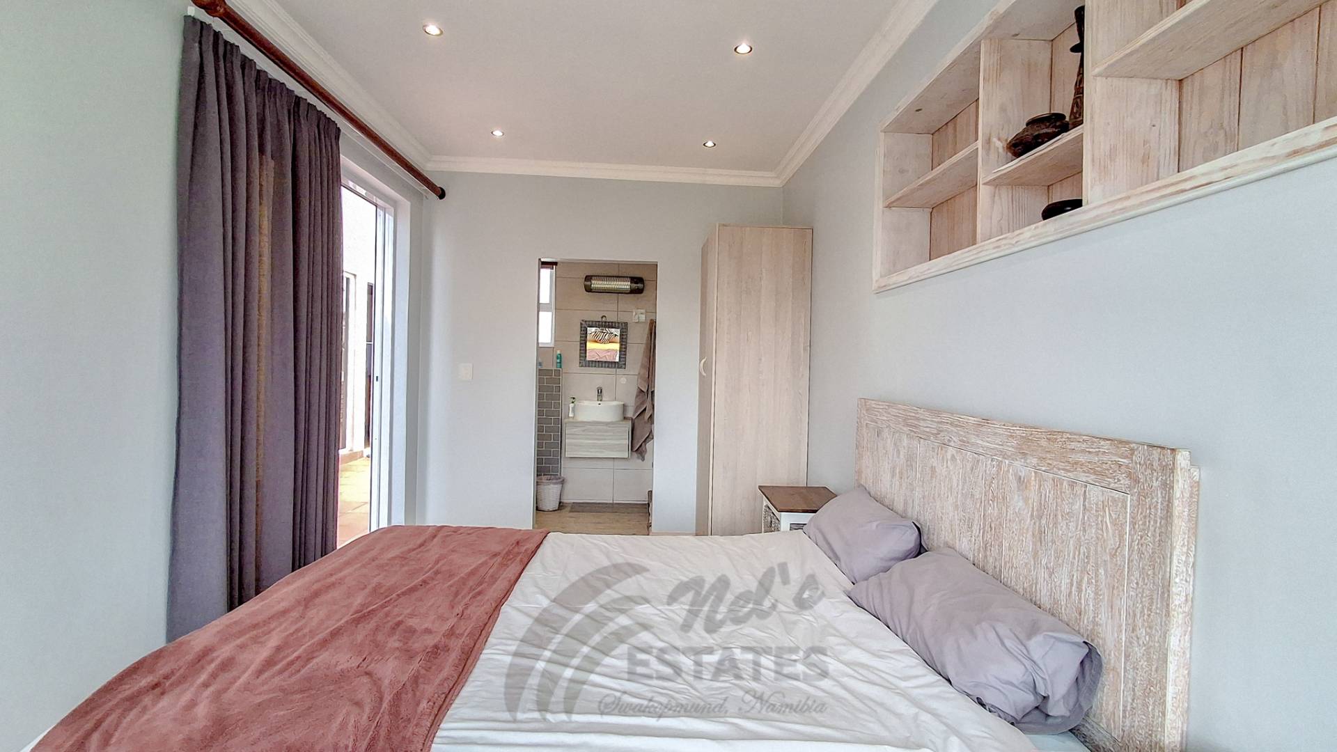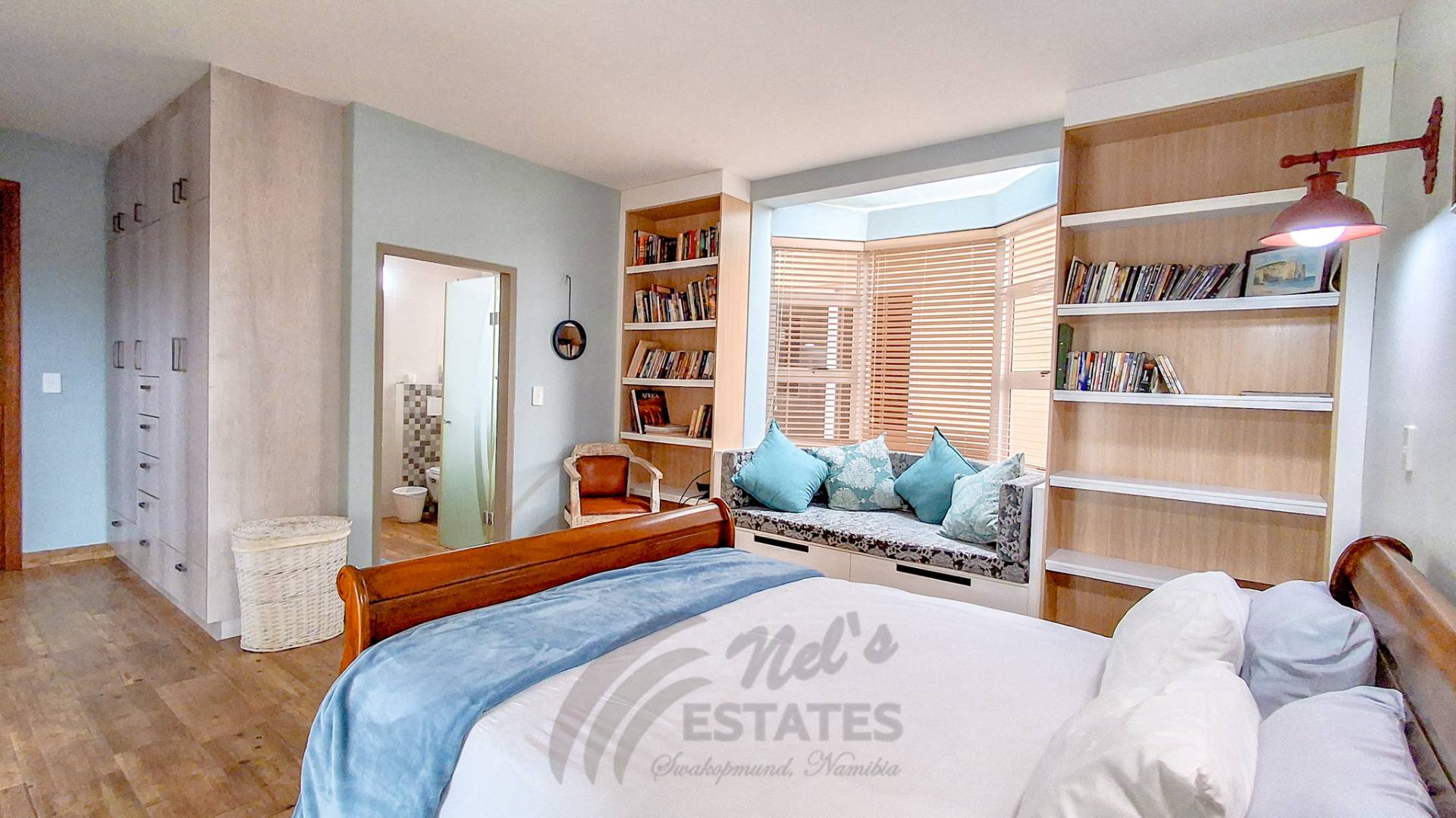 The second bedroom is light-filled and airy, with exposed trusses and built-in cupboards.